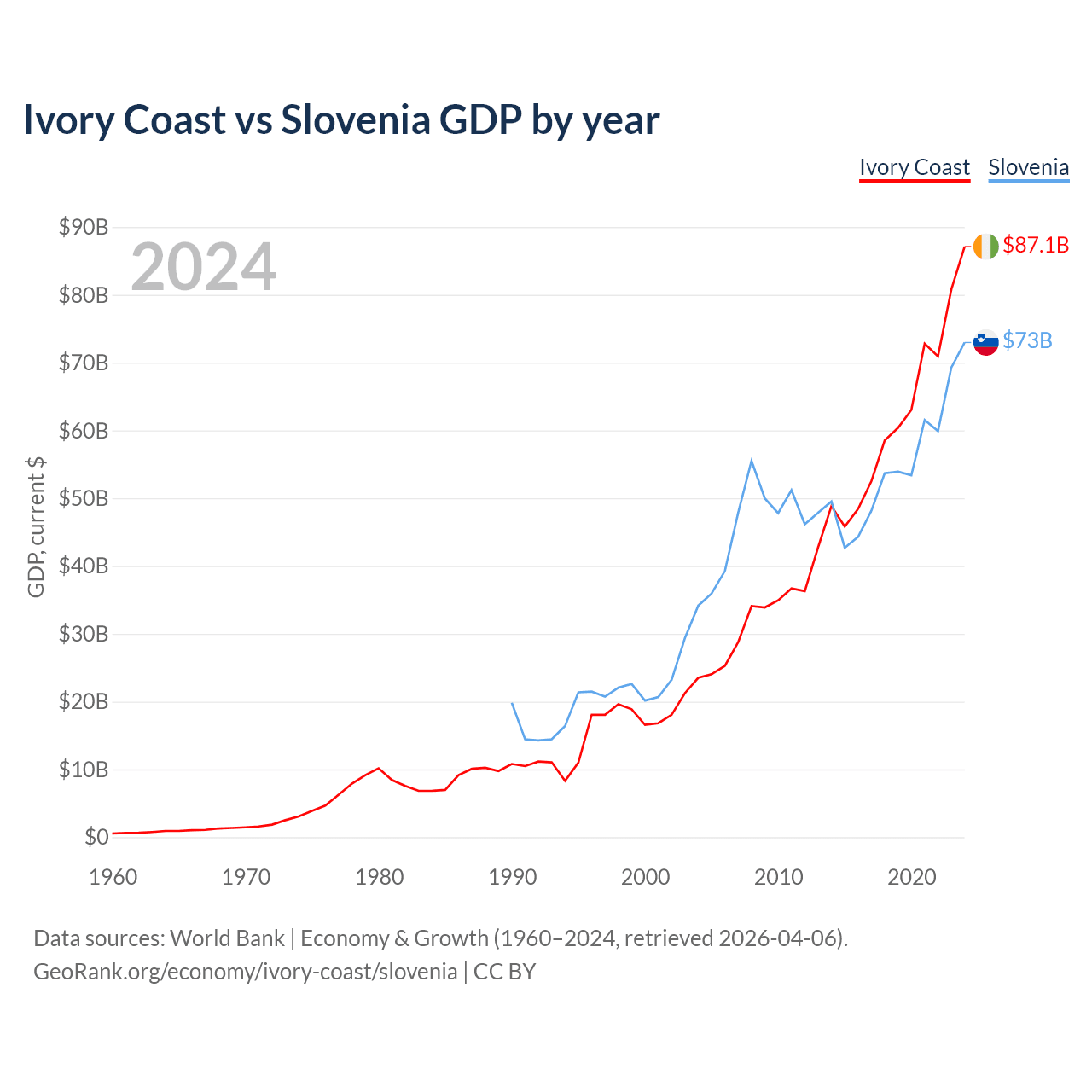 Ivory Coast vs Slovenia GDP by year