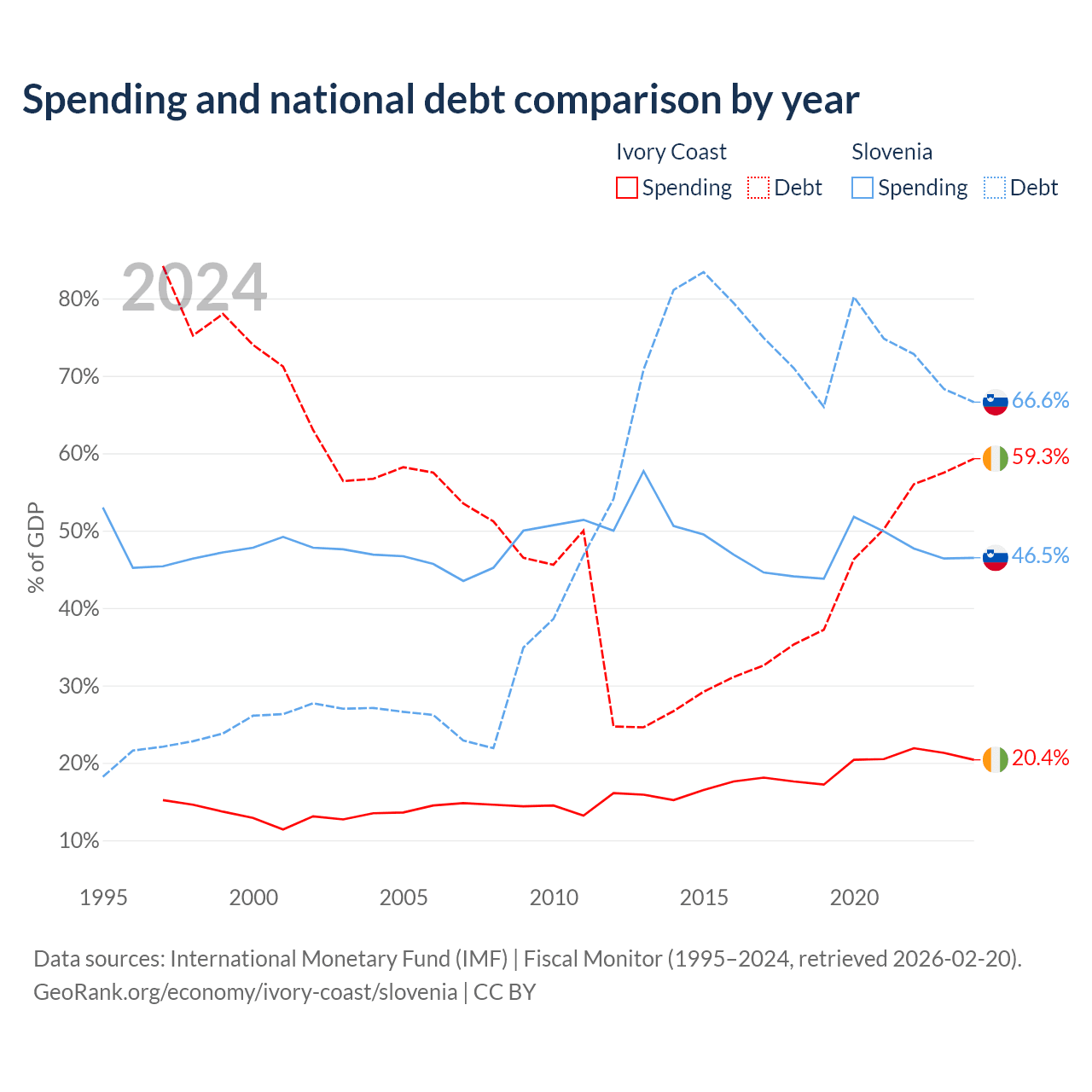 Ivory Coast has $51.6B in government debt (59.3% of GDP), compared to $48.6B (66.6% of GDP) in Slovenia.