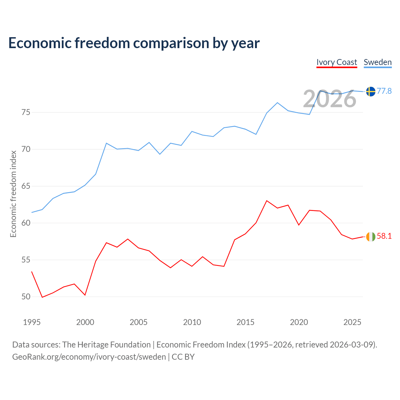 The Economic Freedom Index for Ivory Coast is 58.1, ranking 111/197, compared to 77.8 for Sweden, ranking 14/197. The chart above displays a comparison of annual changes in economic freedom indexes.