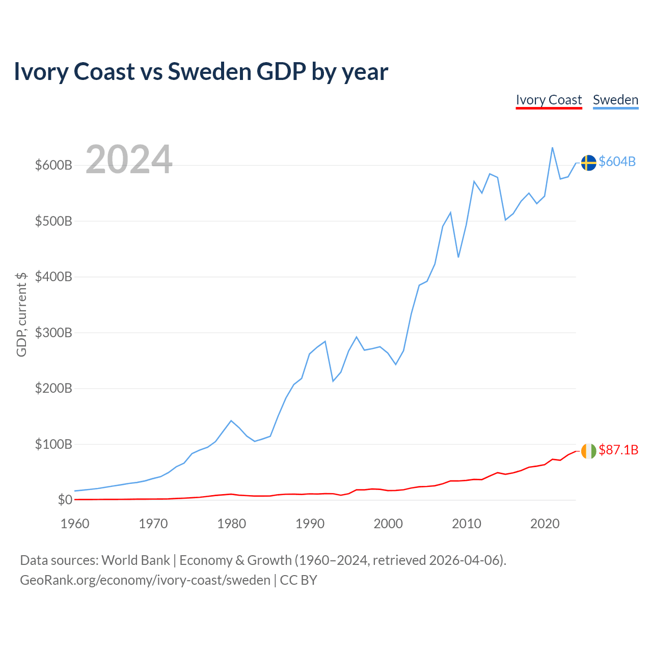 Ivory Coast has a GDP of $87.1B compared to $604B for Sweden, ranking 77/197 and 26/197 by economy size, respectively.