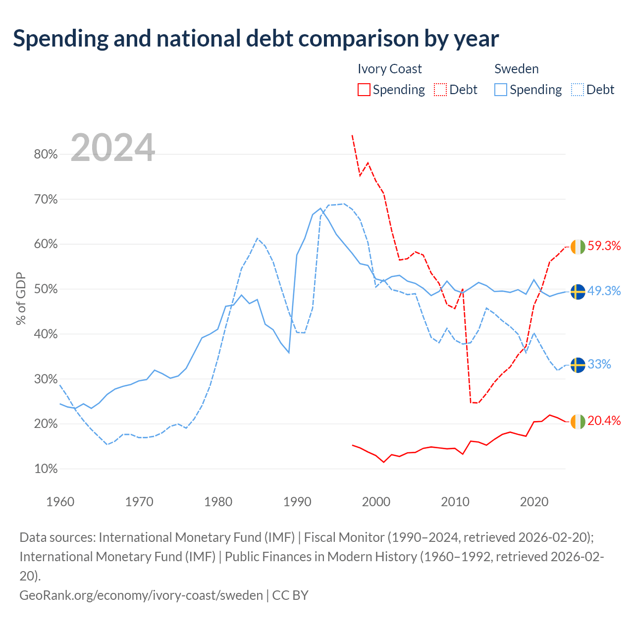Ivory Coast has $51.6B in government debt (59.3% of GDP), compared to $199B (33% of GDP) in Sweden.