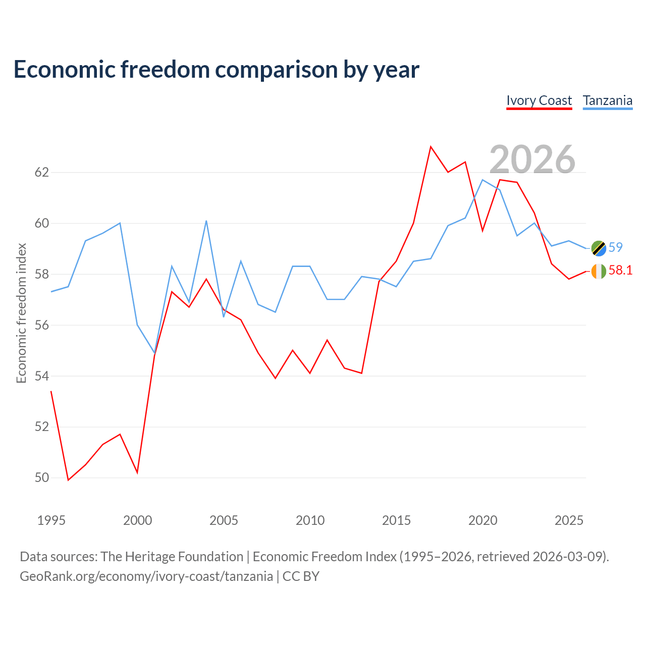 The Economic Freedom Index for Ivory Coast is 58.1, ranking 111/197, compared to 59 for Tanzania, ranking 106/197. The chart above displays a comparison of annual changes in economic freedom indexes.