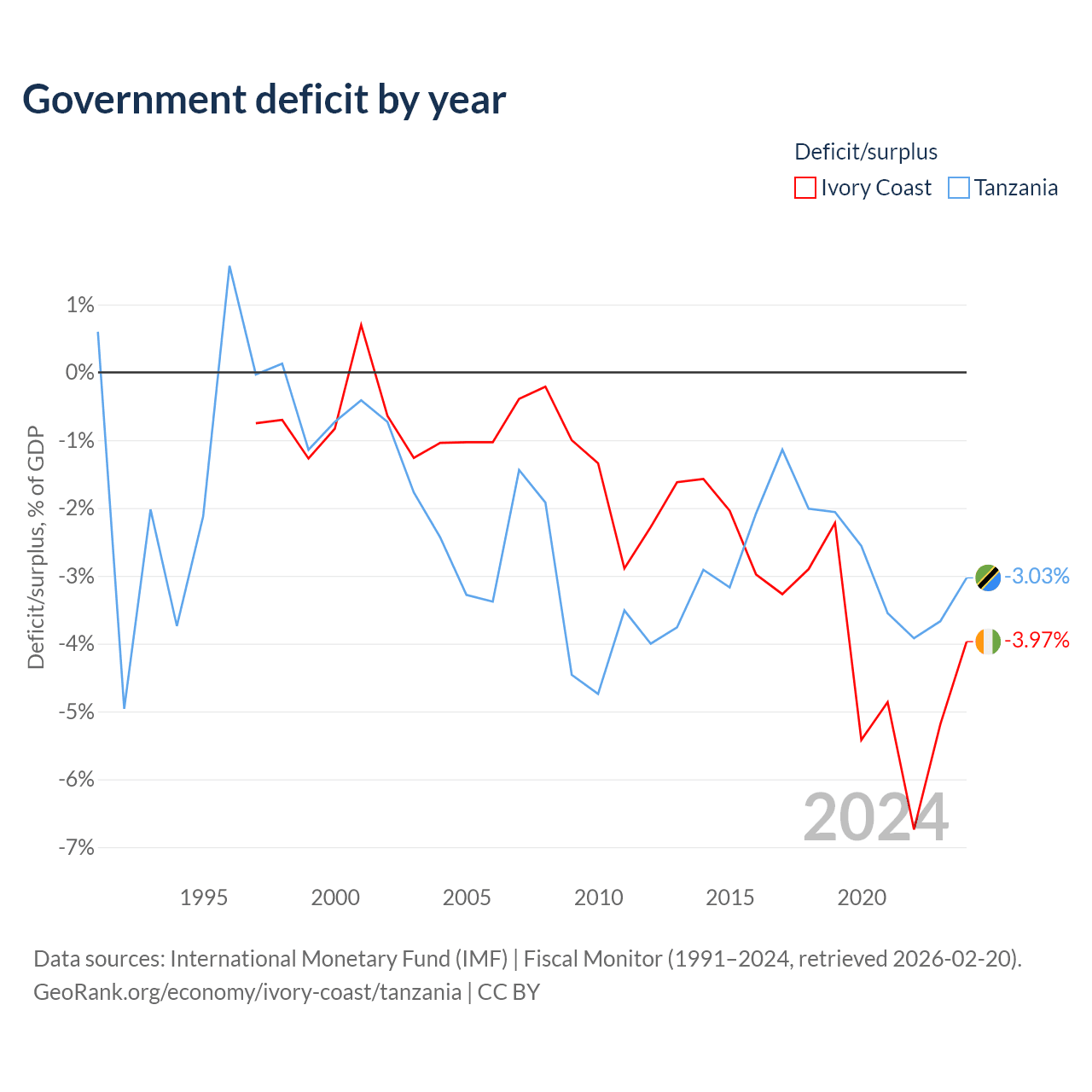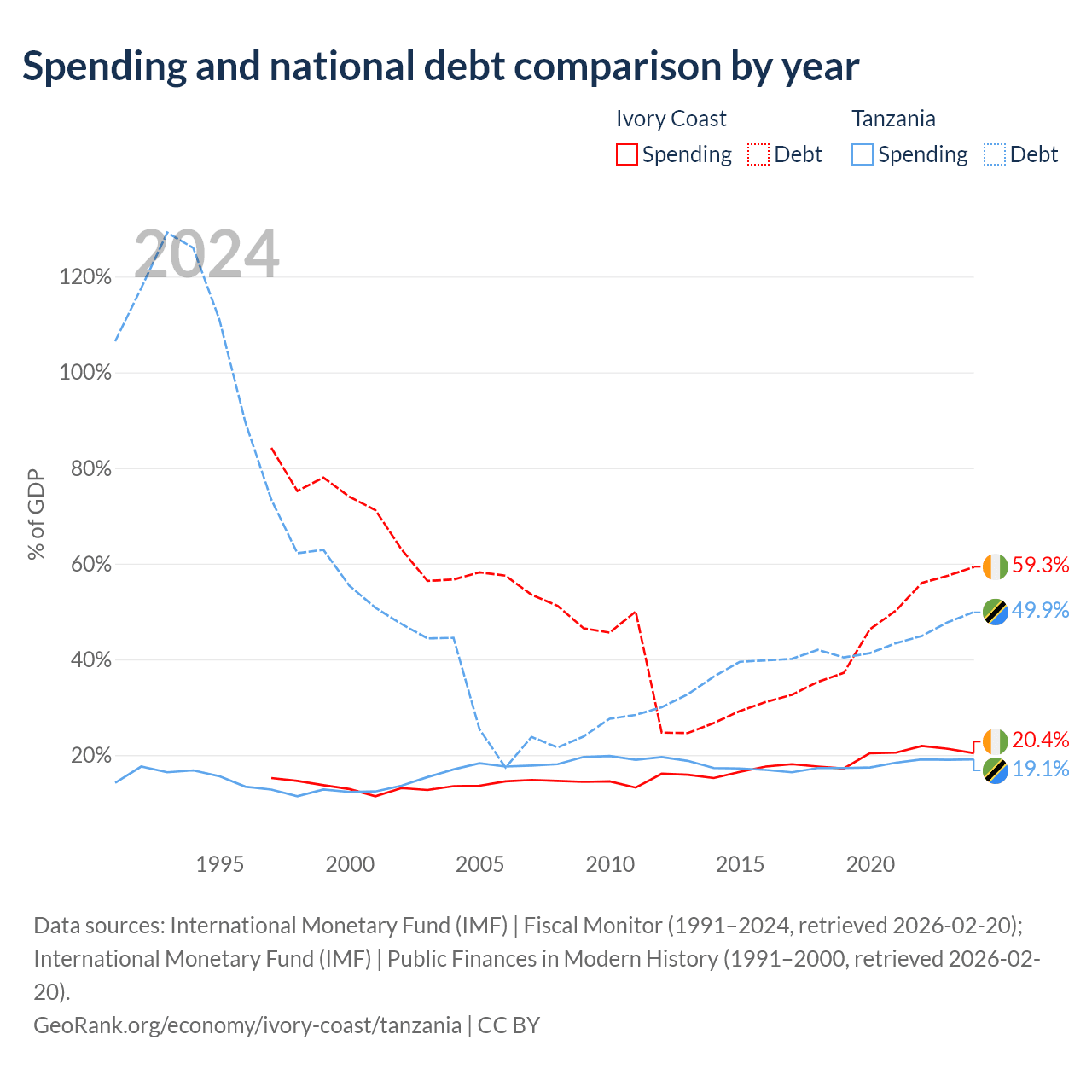 Ivory Coast has $51.6B in government debt (59.3% of GDP), compared to $39.3B (49.9% of GDP) in Tanzania.