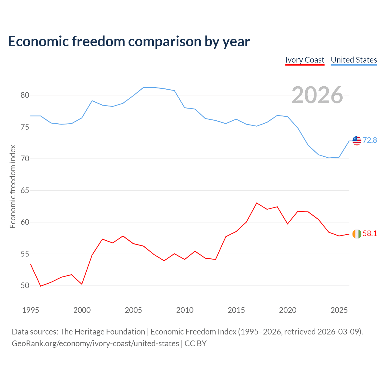 The Economic Freedom Index for Ivory Coast is 58.1, ranking 111/197, compared to 72.8 for the United States, ranking 27/197. The chart above displays a comparison of annual changes in economic freedom indexes.