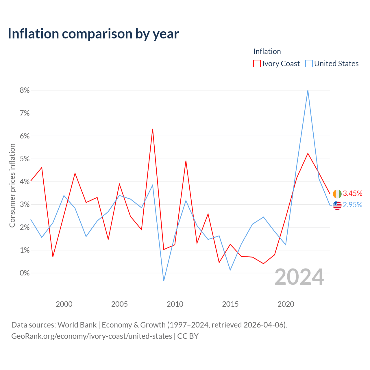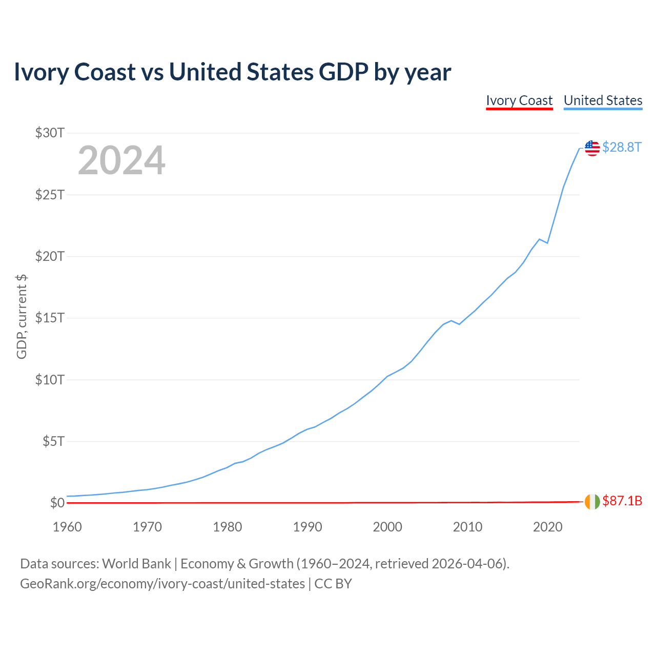 Ivory Coast has a GDP of $87.1B compared to $28.8T for the United States, ranking 77/197 and 1/197 by economy size, respectively.