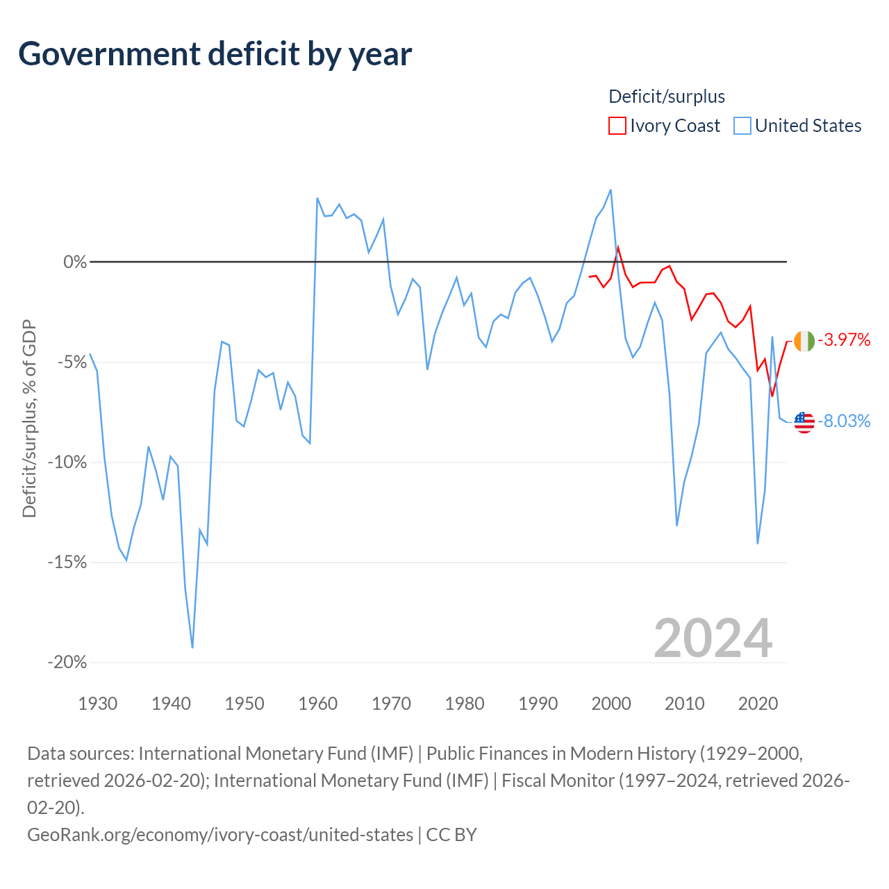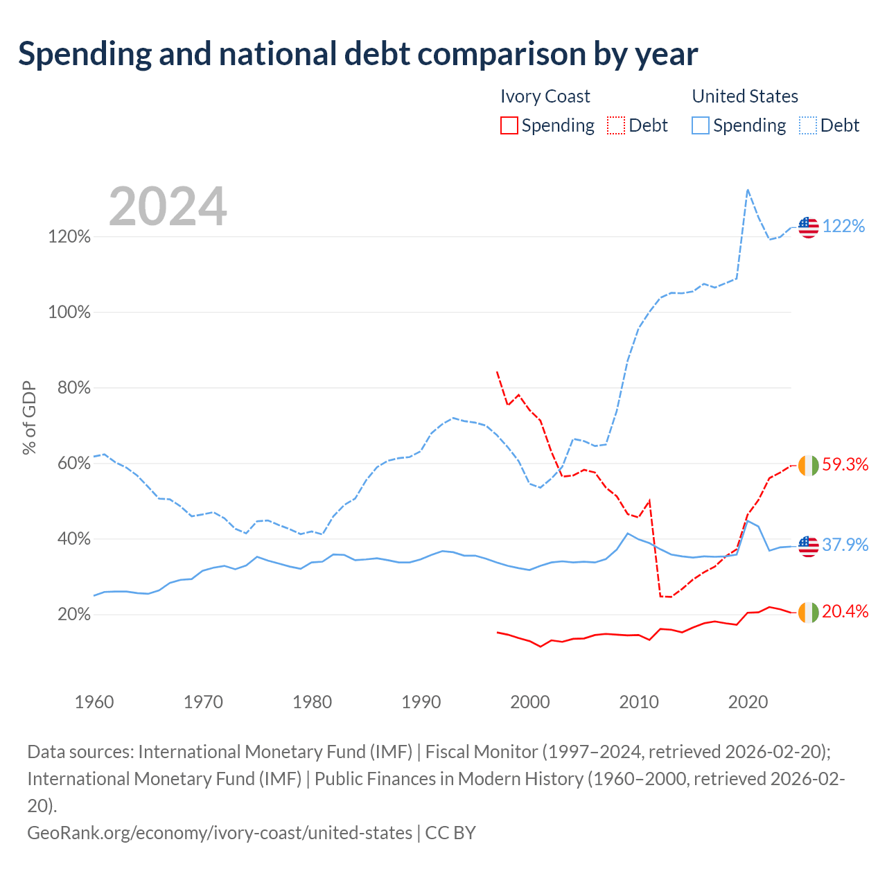 Ivory Coast has $51.6B in government debt (59.3% of GDP), compared to $35.2T (122.3% of GDP) in the United States.