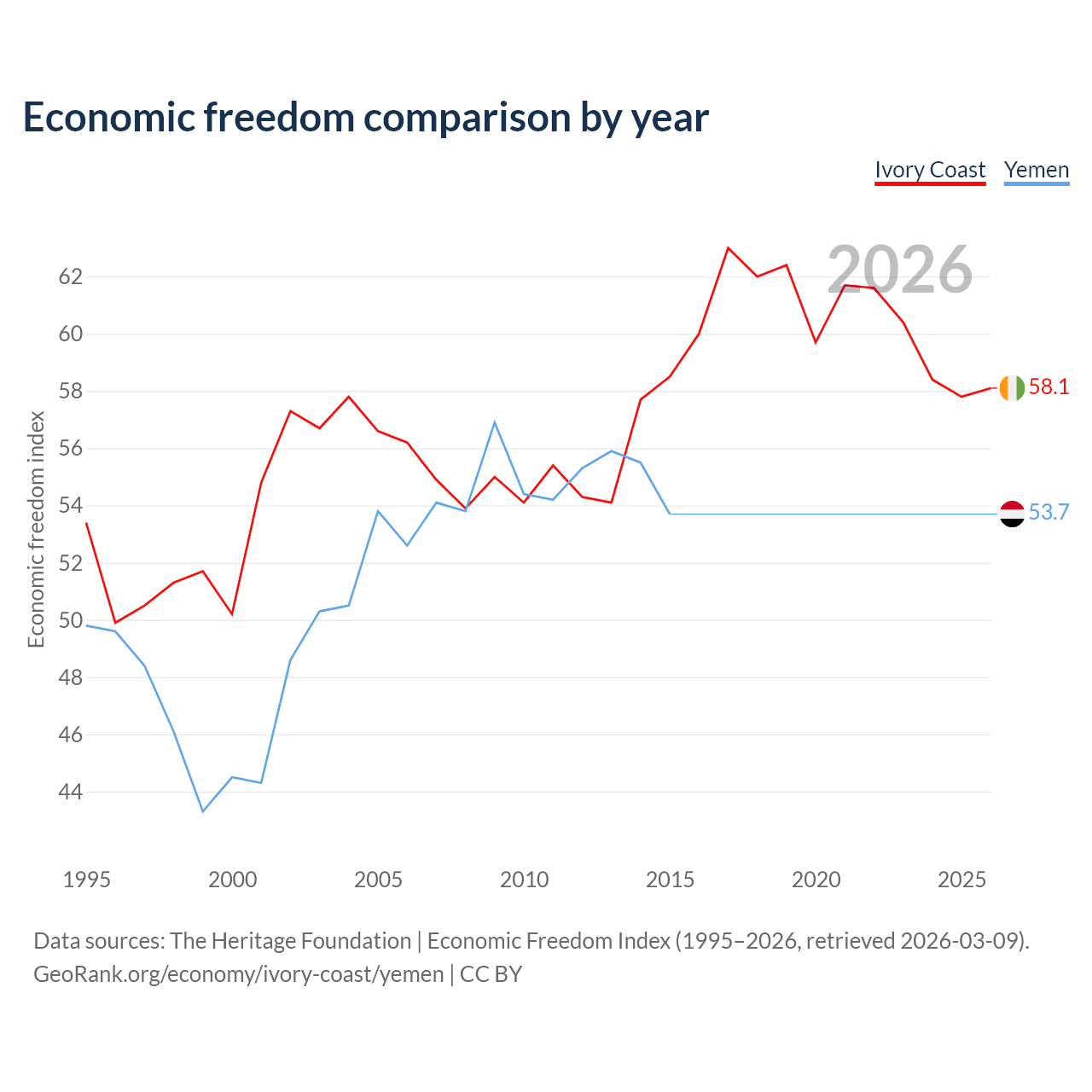 The Economic Freedom Index for Ivory Coast is 58.1, ranking 111/197, compared to 53.7 for Yemen, ranking 138/197. The chart above displays a comparison of annual changes in economic freedom indexes.