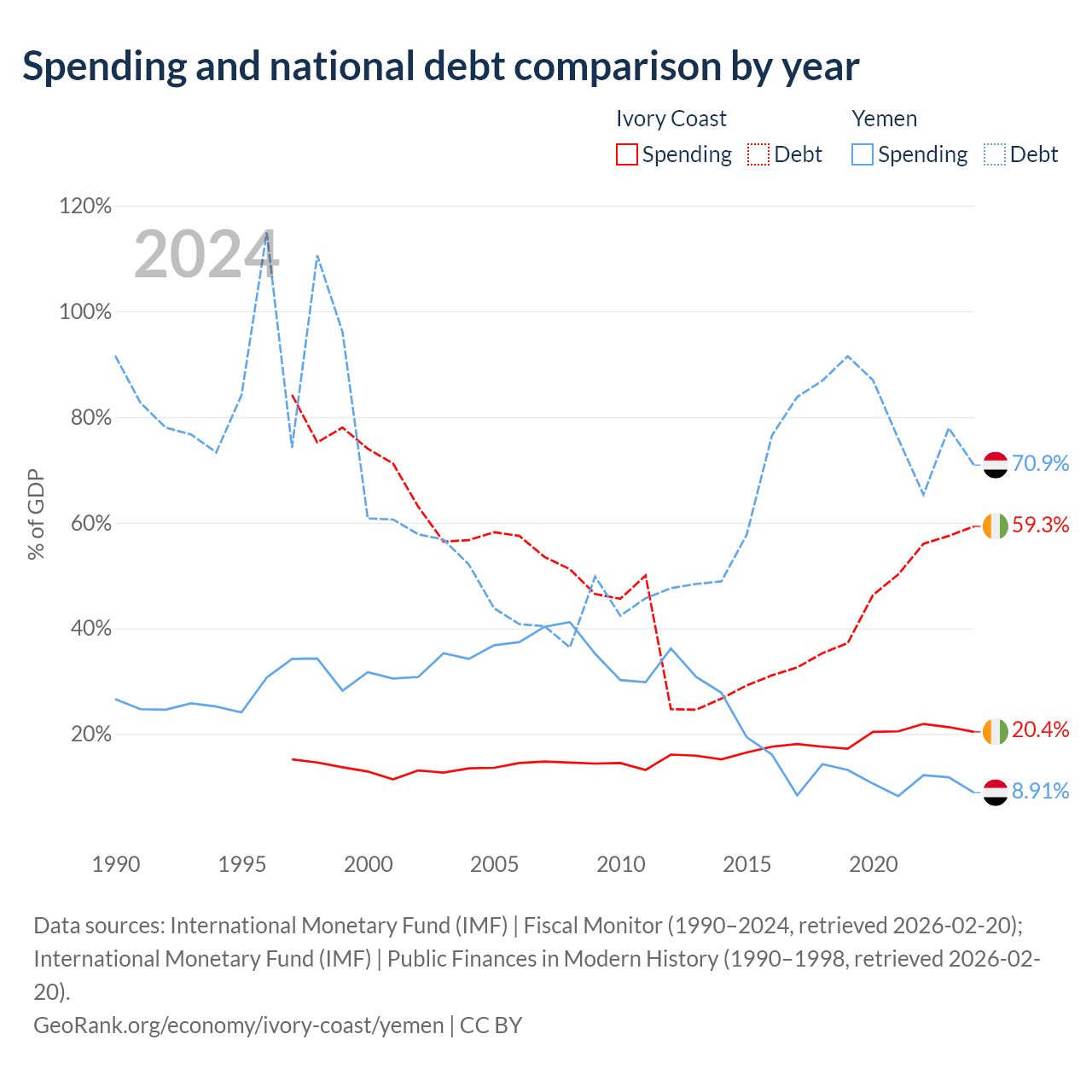Ivory Coast has $51.6B in government debt (59.3% of GDP), compared to $18.8B (70.9% of GDP) in Yemen.