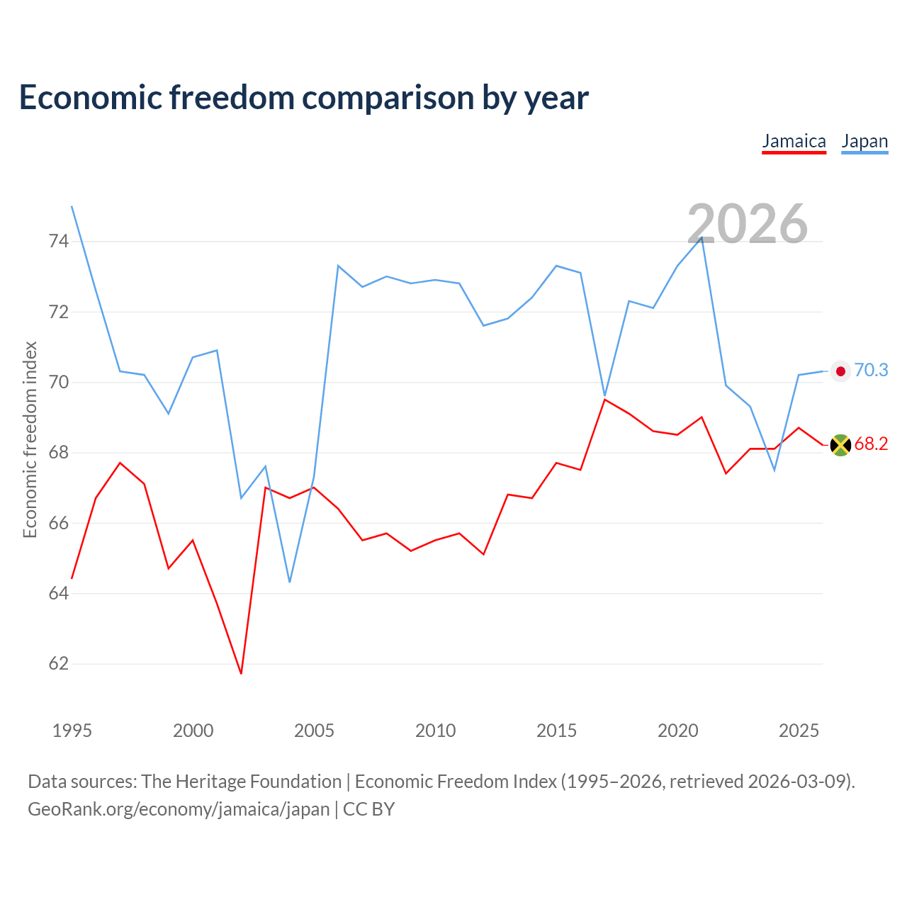 The Economic Freedom Index for Jamaica is 68.2, ranking 48/197, compared to 70.3 for Japan, ranking 36/197. The chart above displays a comparison of annual changes in economic freedom indexes.