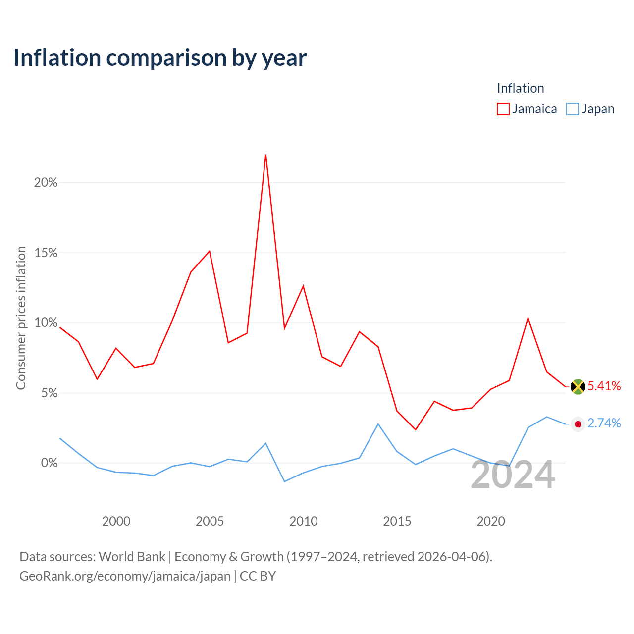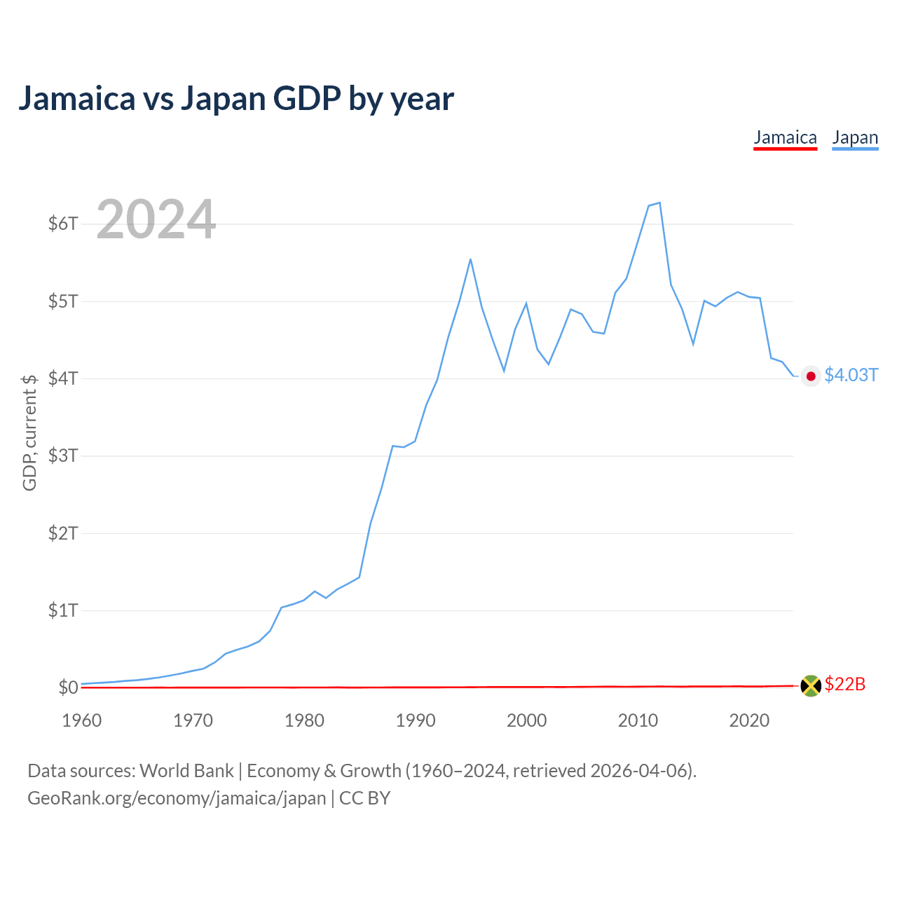 Jamaica has a GDP of $22B compared to $4.03T for Japan, ranking 124/197 and 4/197 by economy size, respectively.