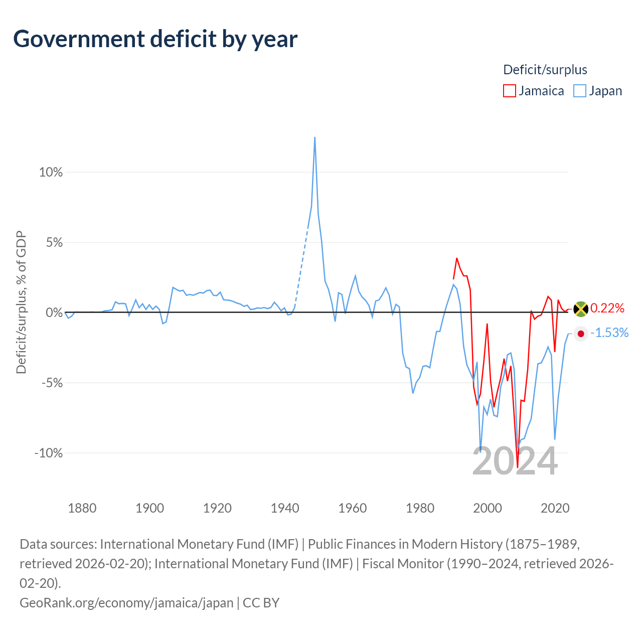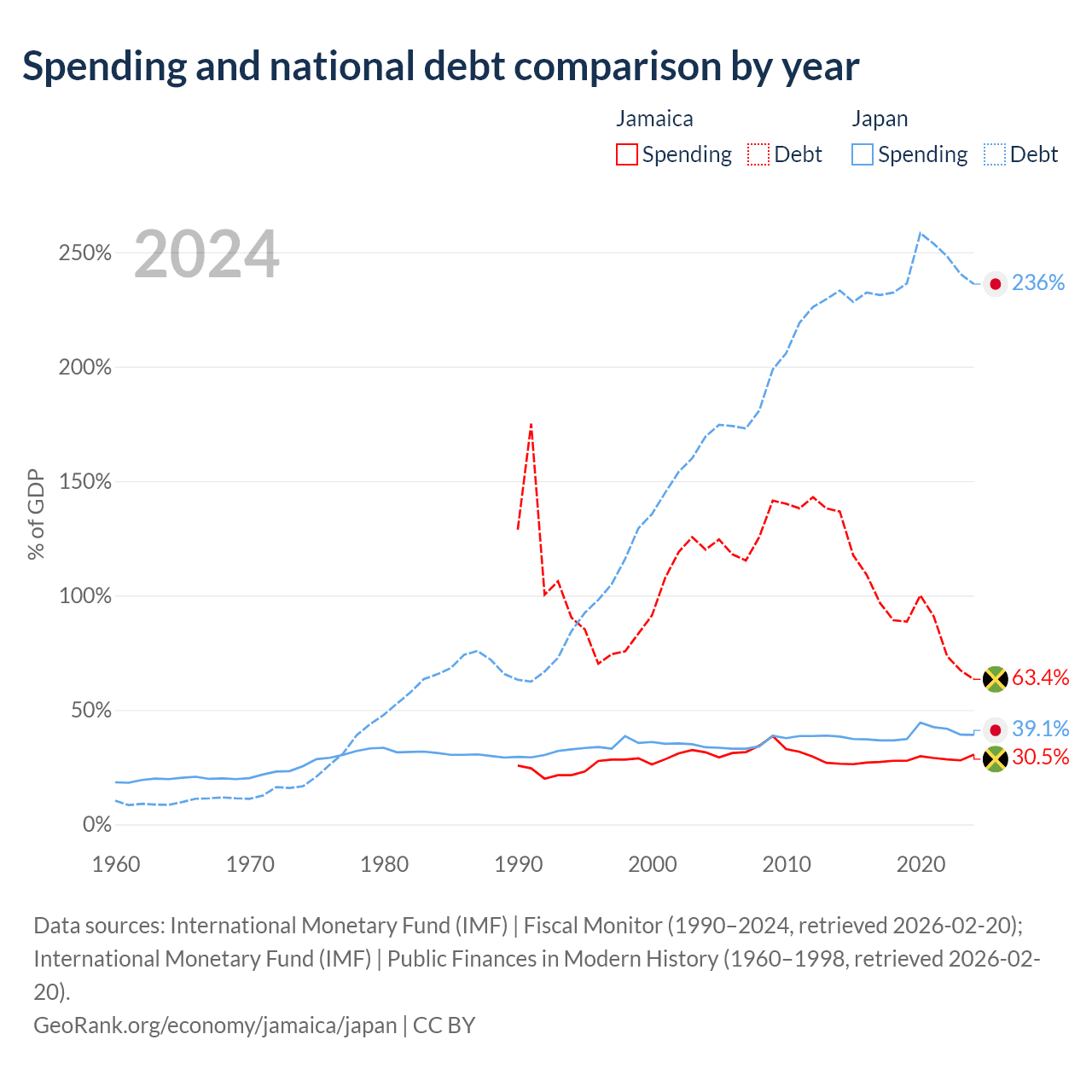 Jamaica has $14B in government debt (63.4% of GDP), compared to $9.51T (236.1% of GDP) in Japan.