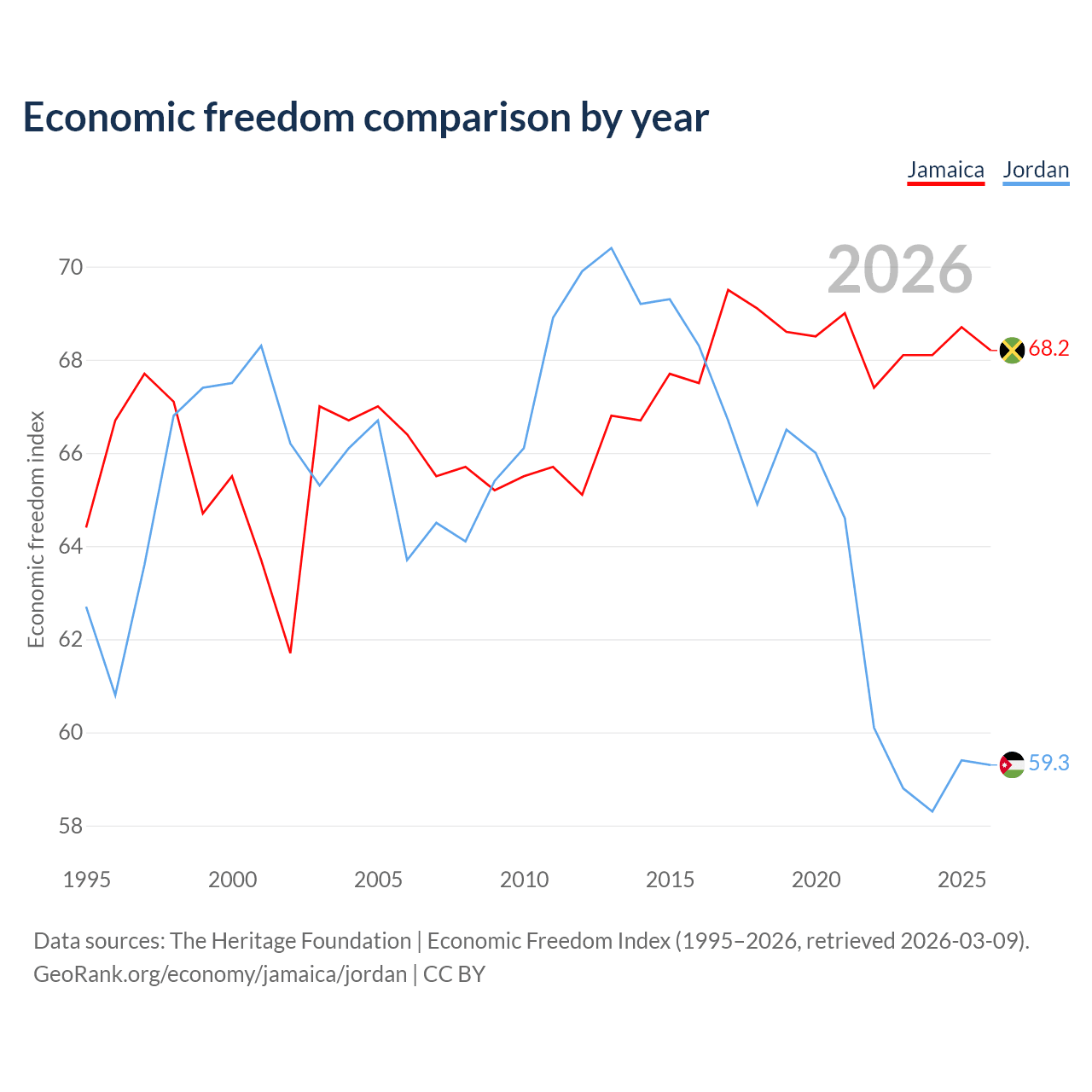The Economic Freedom Index for Jamaica is 68.2, ranking 48/197, compared to 59.3 for Jordan, ranking 104/197. The chart above displays a comparison of annual changes in economic freedom indexes.