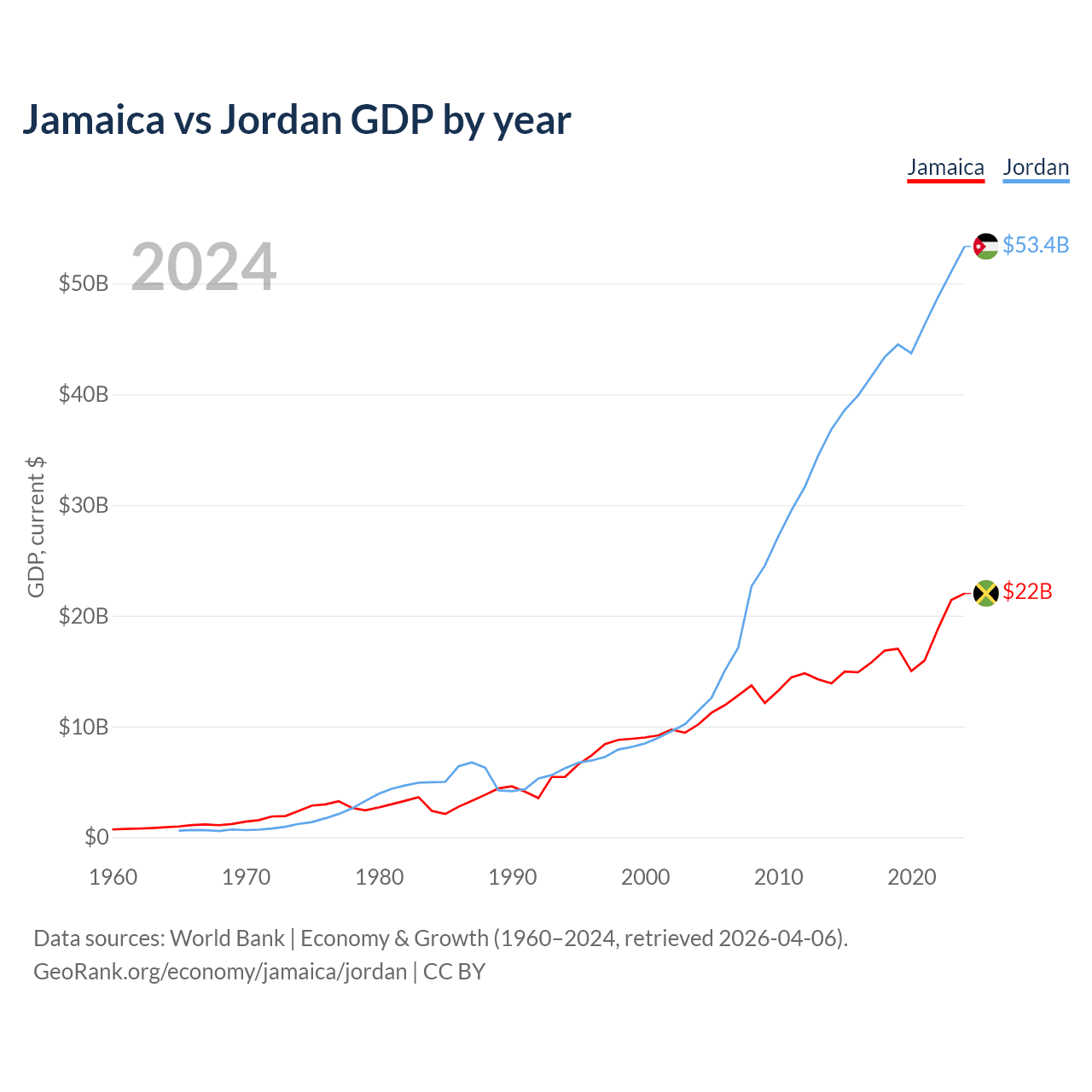 Jamaica vs Jordan GDP by year