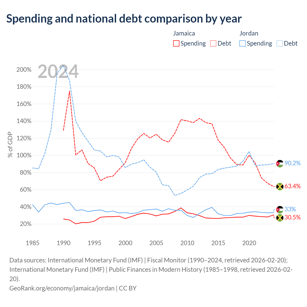 Jamaica has $14B in government debt (63.4% of GDP), compared to $48.1B (90.2% of GDP) in Jordan.