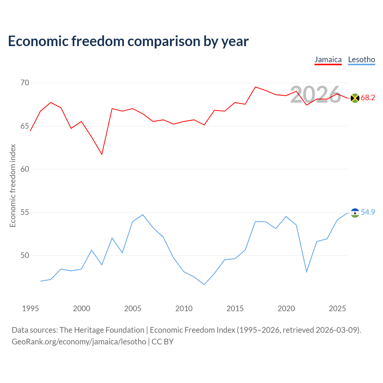The Economic Freedom Index for Jamaica is 68.2, ranking 48/197, compared to 54.9 for Lesotho, ranking 130/197. The chart above displays a comparison of annual changes in economic freedom indexes.