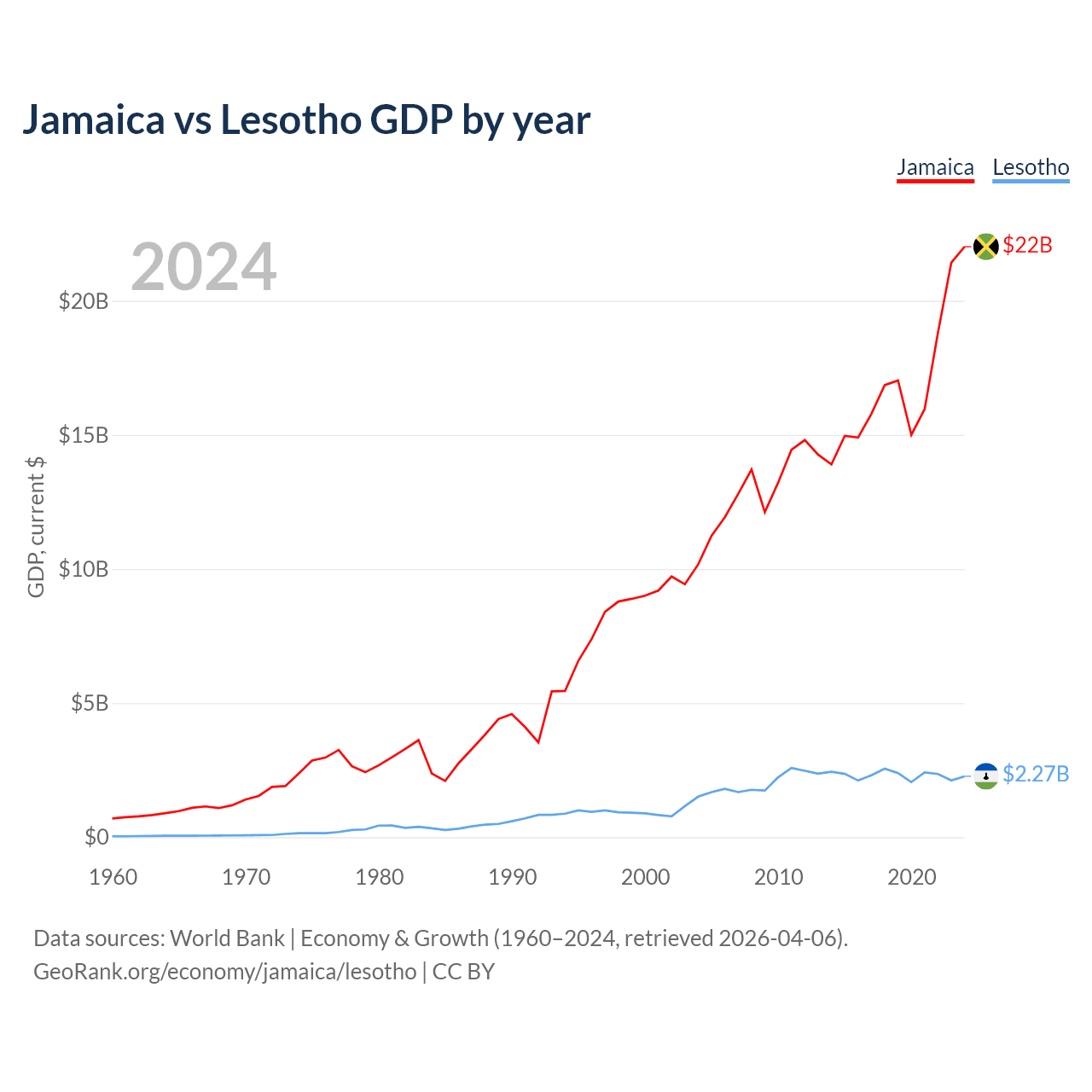 Jamaica vs Lesotho GDP by year
