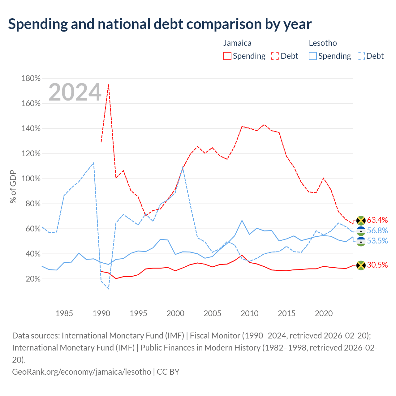 Jamaica has $14B in government debt (63.4% of GDP), compared to $1.29B (56.8% of GDP) in Lesotho.