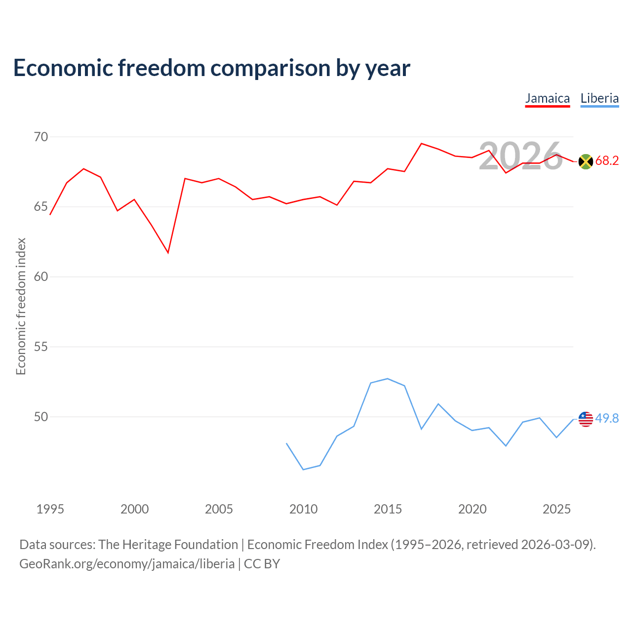 The Economic Freedom Index for Jamaica is 68.2, ranking 48/197, compared to 49.8 for Liberia, ranking 163/197. The chart above displays a comparison of annual changes in economic freedom indexes.