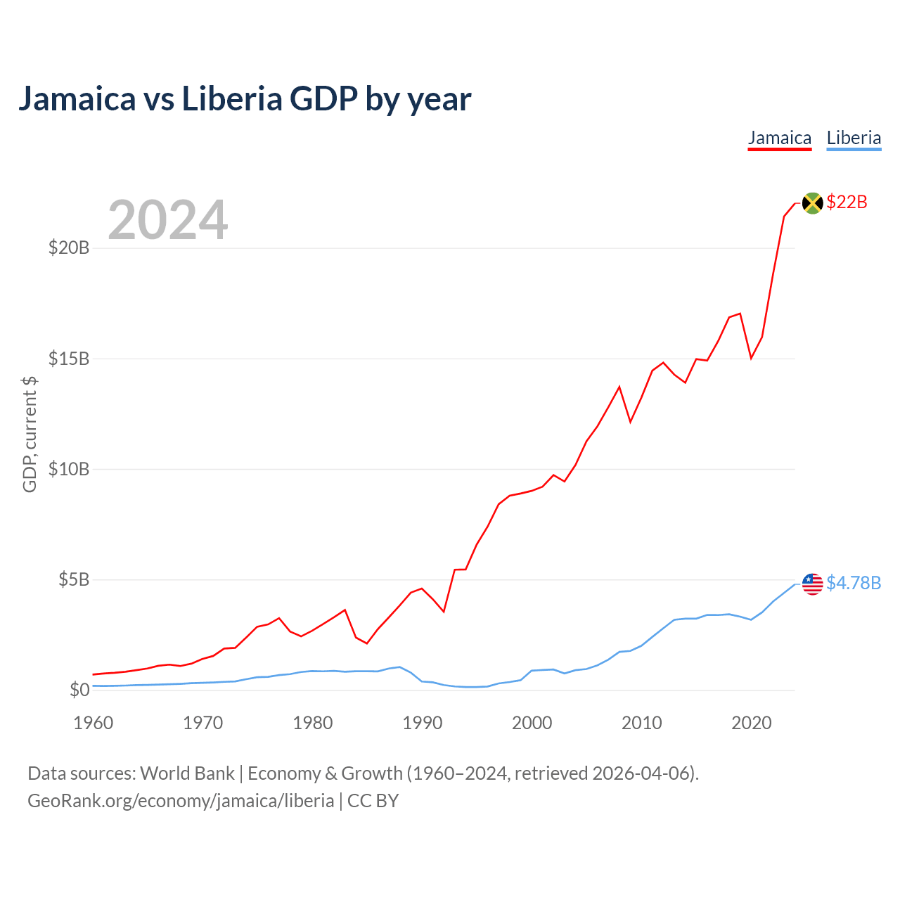 Jamaica vs Liberia GDP by year