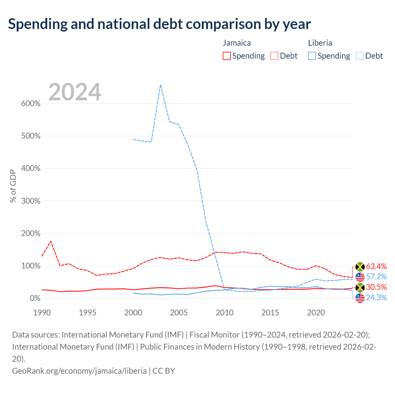 Jamaica has $14B in government debt (63.4% of GDP), compared to $2.73B (57.2% of GDP) in Liberia.