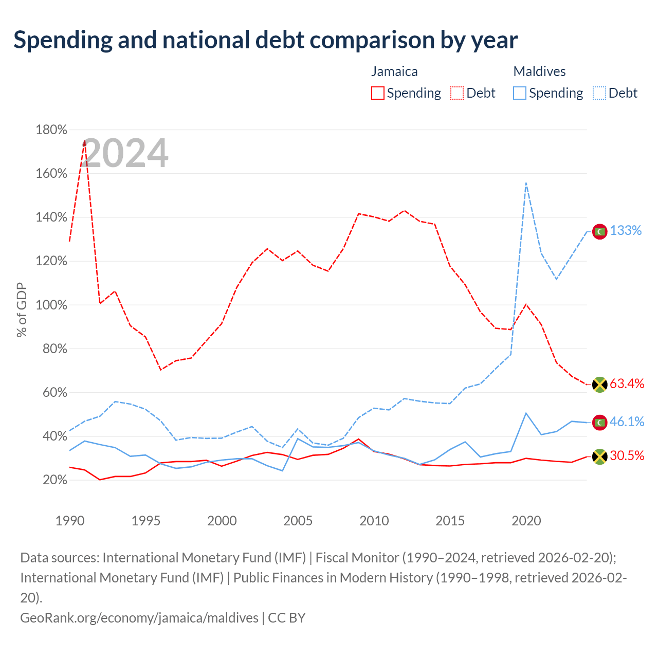 Jamaica has $14B in government debt (63.4% of GDP), compared to $9.41B (133.3% of GDP) in Maldives.
