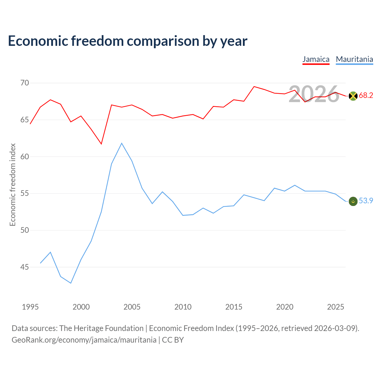 The Economic Freedom Index for Jamaica is 68.2, ranking 48/197, compared to 53.9 for Mauritania, ranking 136/197. The chart above displays a comparison of annual changes in economic freedom indexes.
