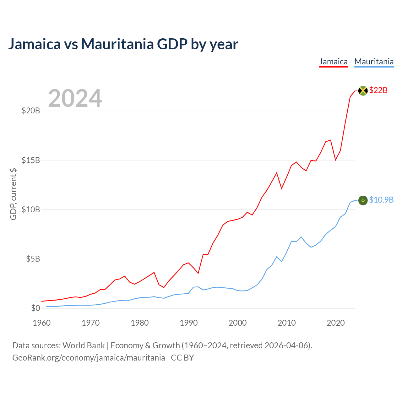 Jamaica vs Mauritania GDP by year