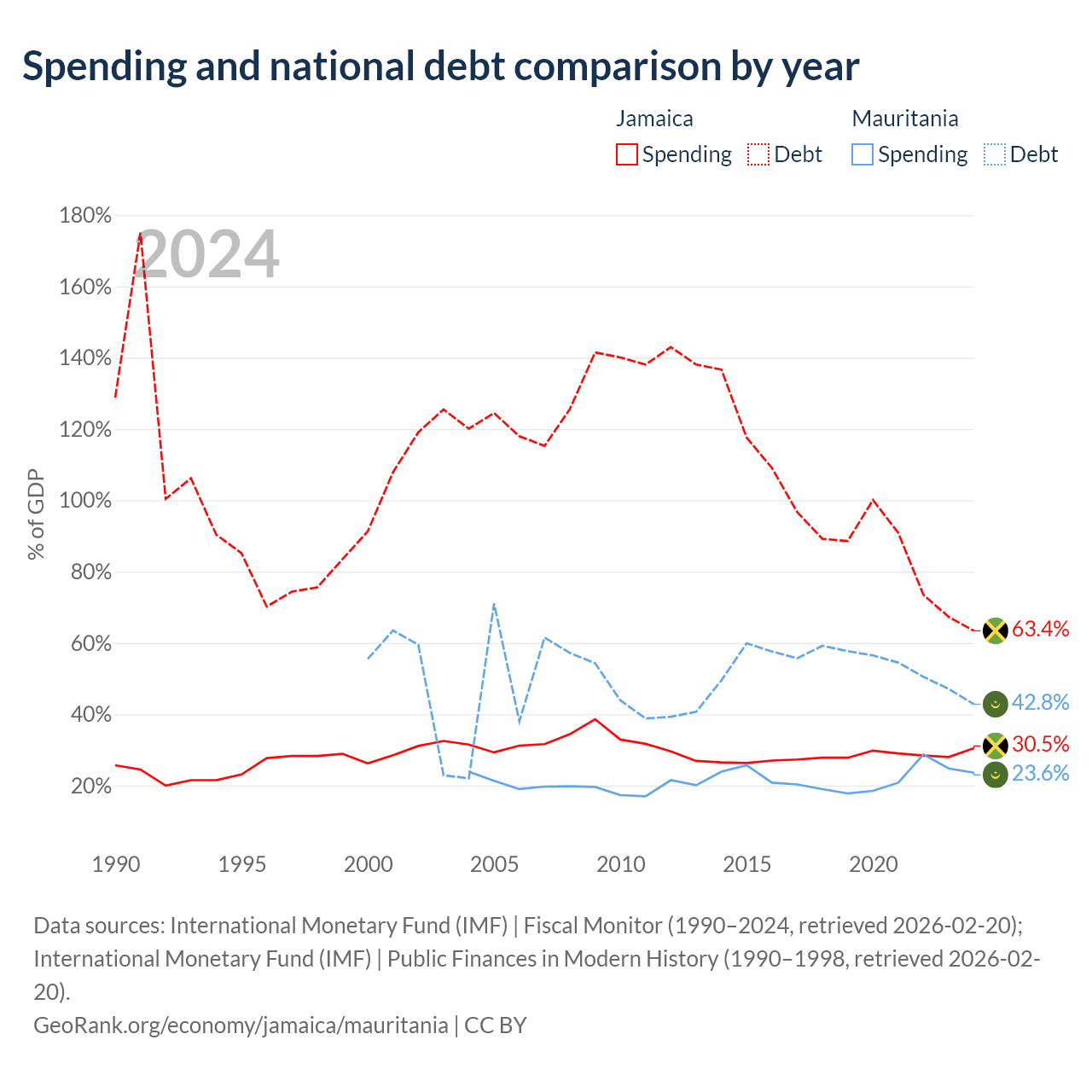 Jamaica has $14B in government debt (63.4% of GDP), compared to $4.67B (42.8% of GDP) in Mauritania.