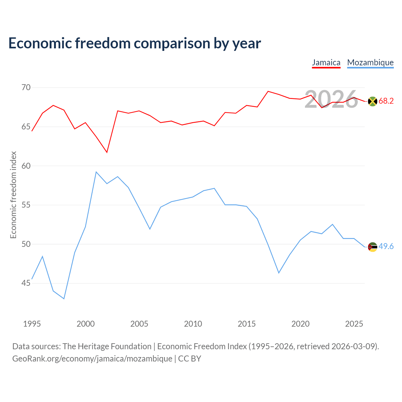 The Economic Freedom Index for Jamaica is 68.2, ranking 48/197, compared to 49.6 for Mozambique, ranking 164/197. The chart above displays a comparison of annual changes in economic freedom indexes.