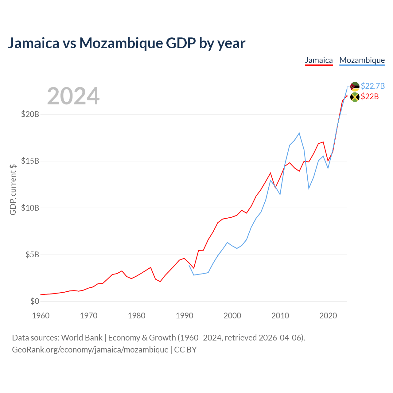 Jamaica vs Mozambique GDP by year