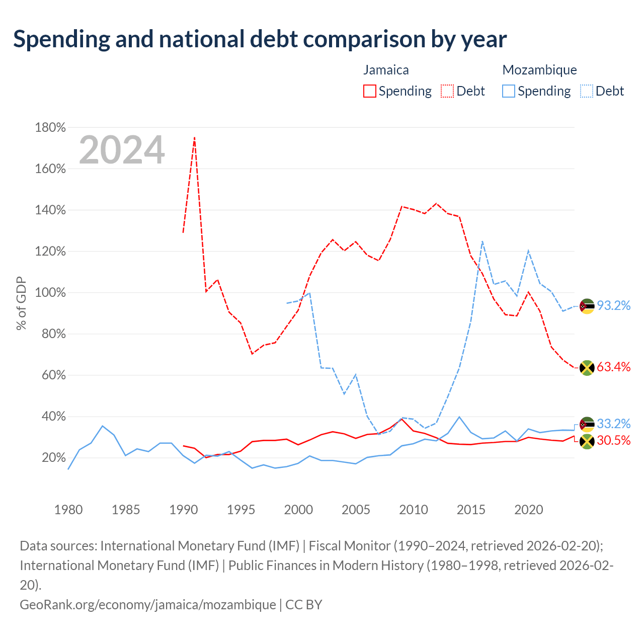 Jamaica has $14B in government debt (63.4% of GDP), compared to $21.2B (93.2% of GDP) in Mozambique.