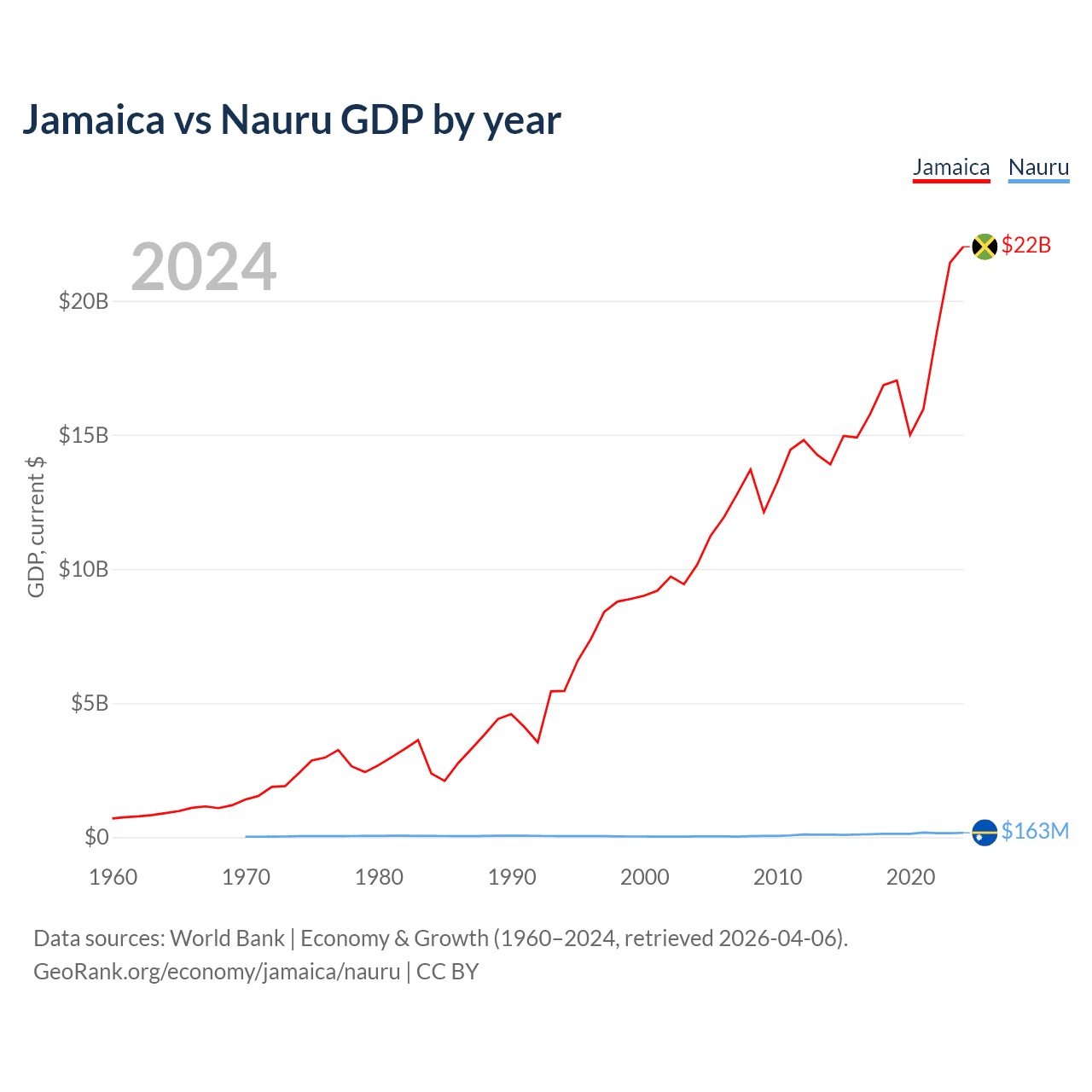 Jamaica has a GDP of $22B compared to $163M for Nauru, ranking 124/197 and 195/197 by economy size, respectively.