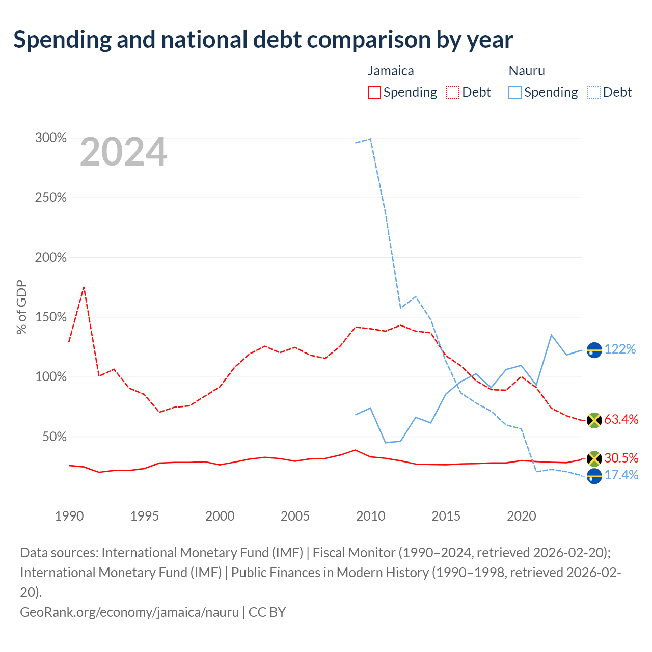 Jamaica has $14B in government debt (63.4% of GDP), compared to $28.3M (17.4% of GDP) in Nauru.