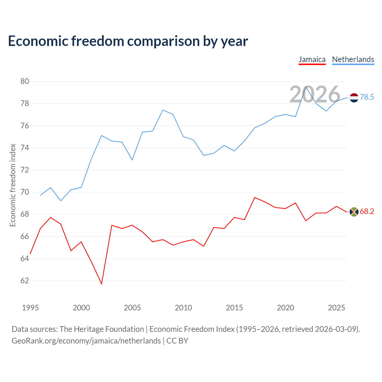 The Economic Freedom Index for Jamaica is 68.2, ranking 48/197, compared to 78.5 for the Netherlands, ranking 11/197. The chart above displays a comparison of annual changes in economic freedom indexes.