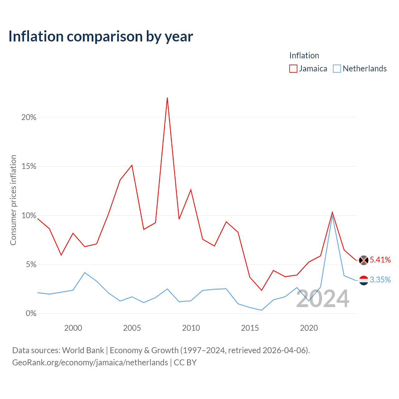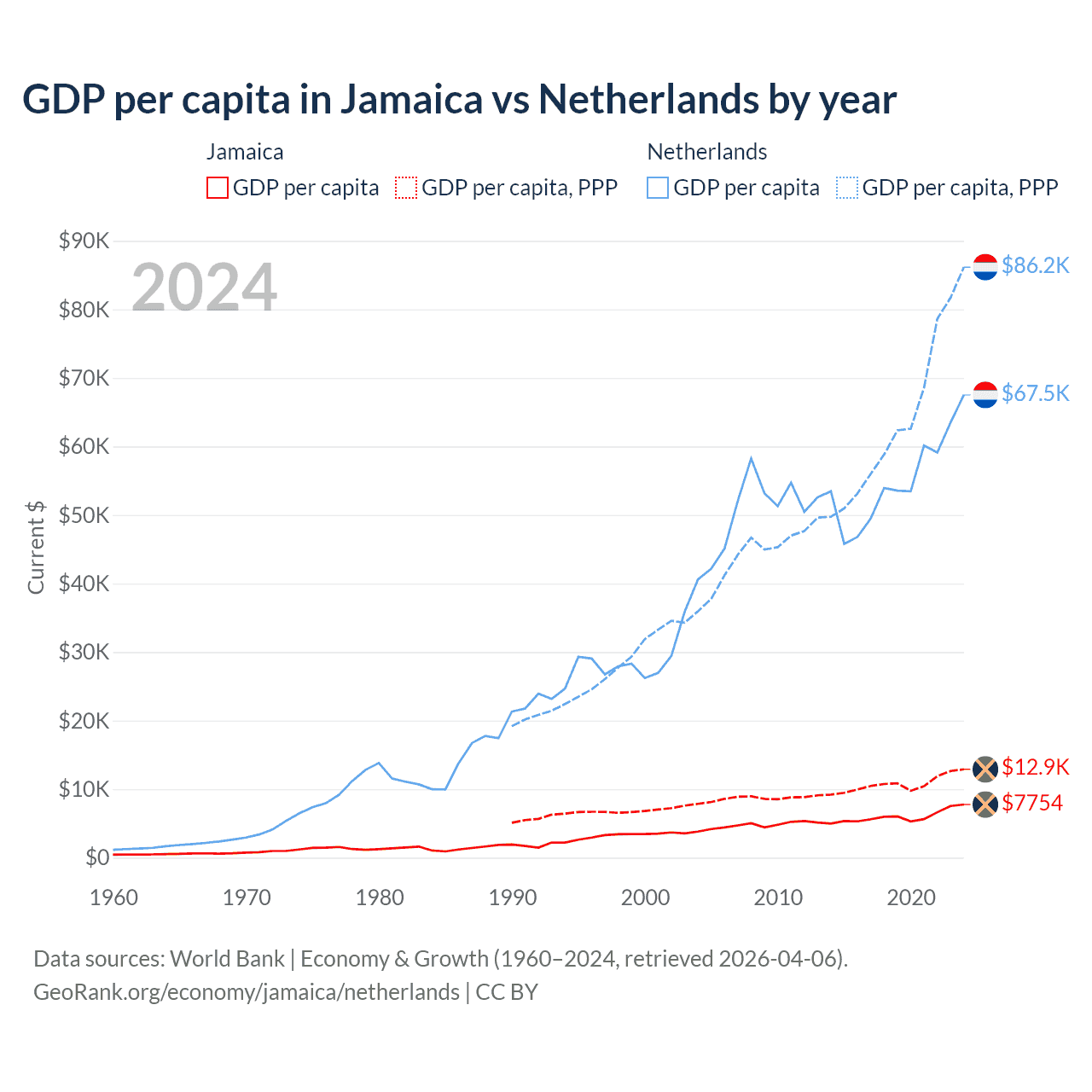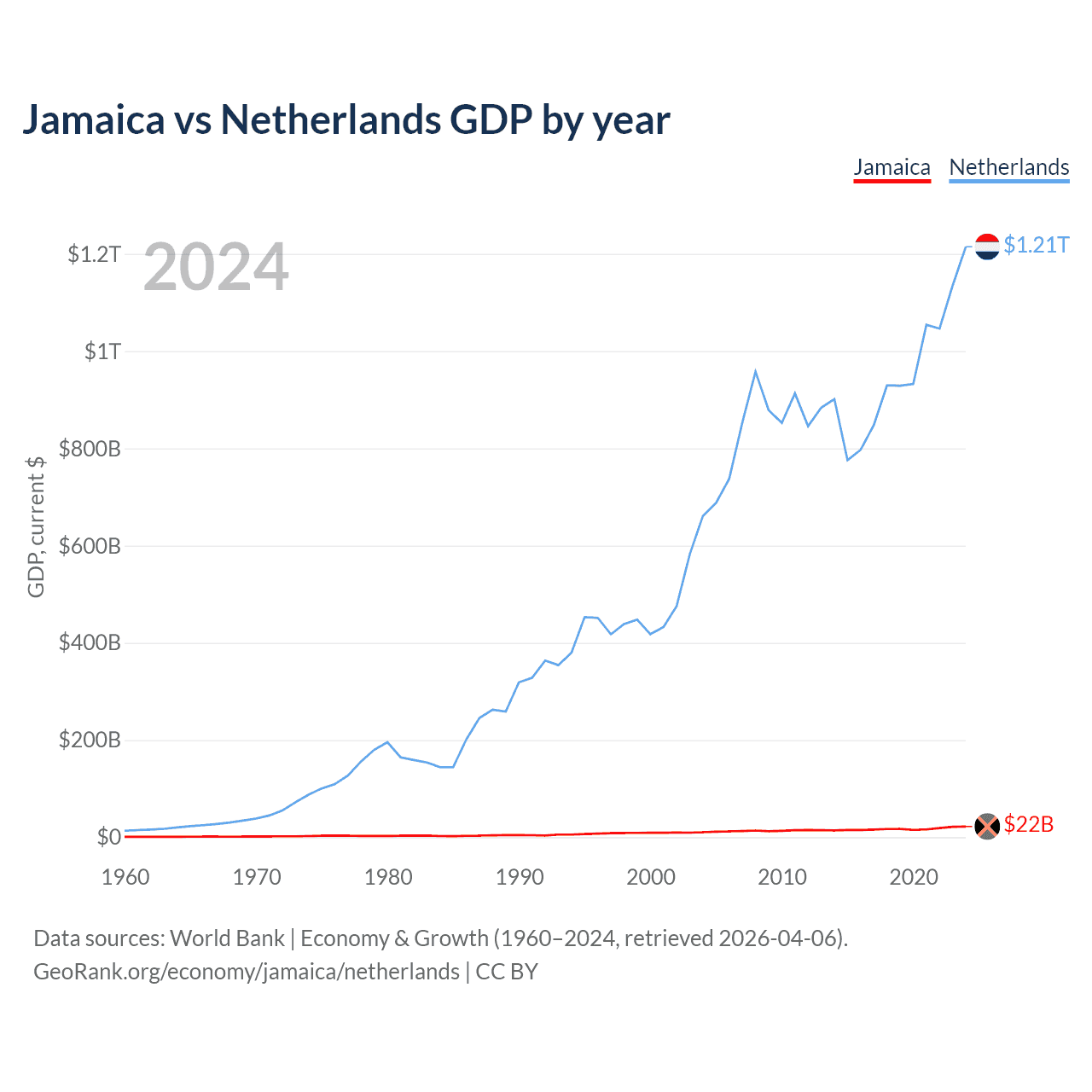 Jamaica vs Netherlands GDP by year