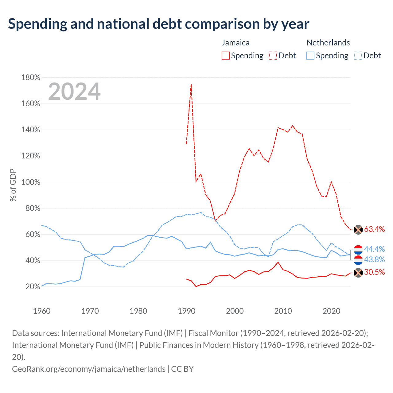 Jamaica has $14B in government debt (63.4% of GDP), compared to $532B (43.8% of GDP) in the Netherlands.