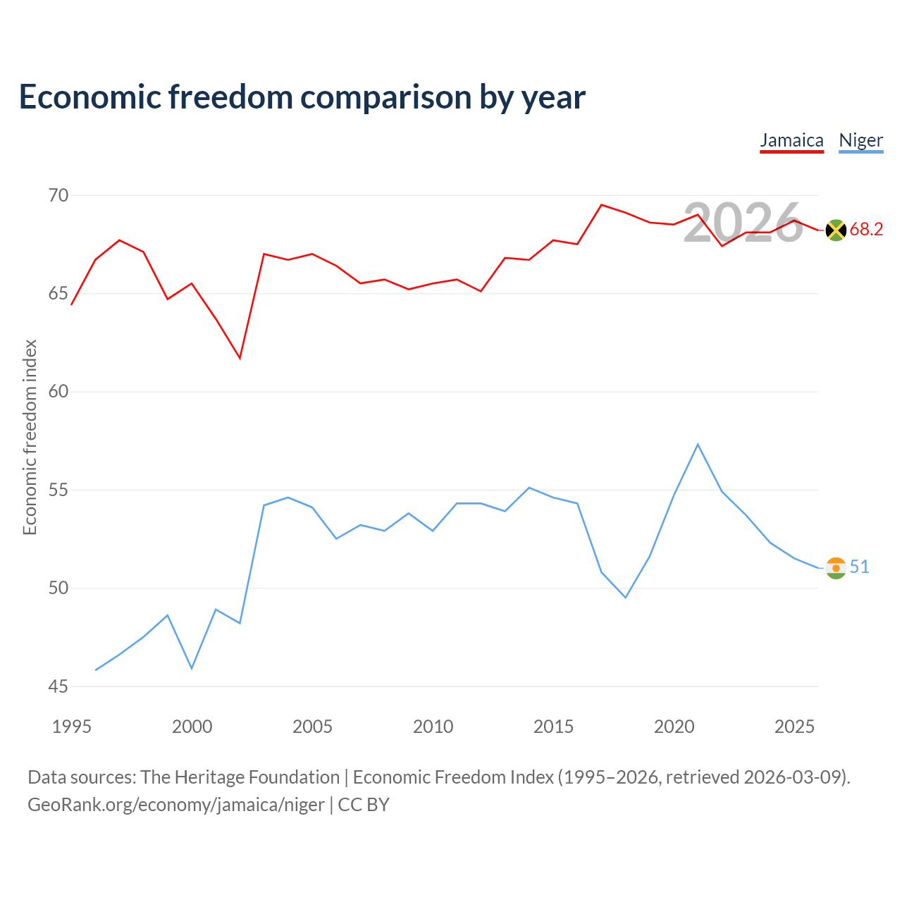 The Economic Freedom Index for Jamaica is 68.2, ranking 48/197, compared to 51 for Niger, ranking 156/197. The chart above displays a comparison of annual changes in economic freedom indexes.