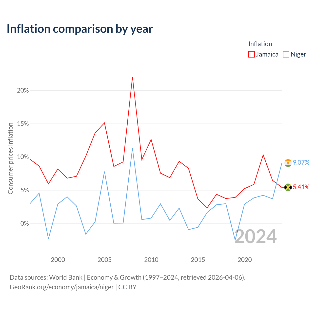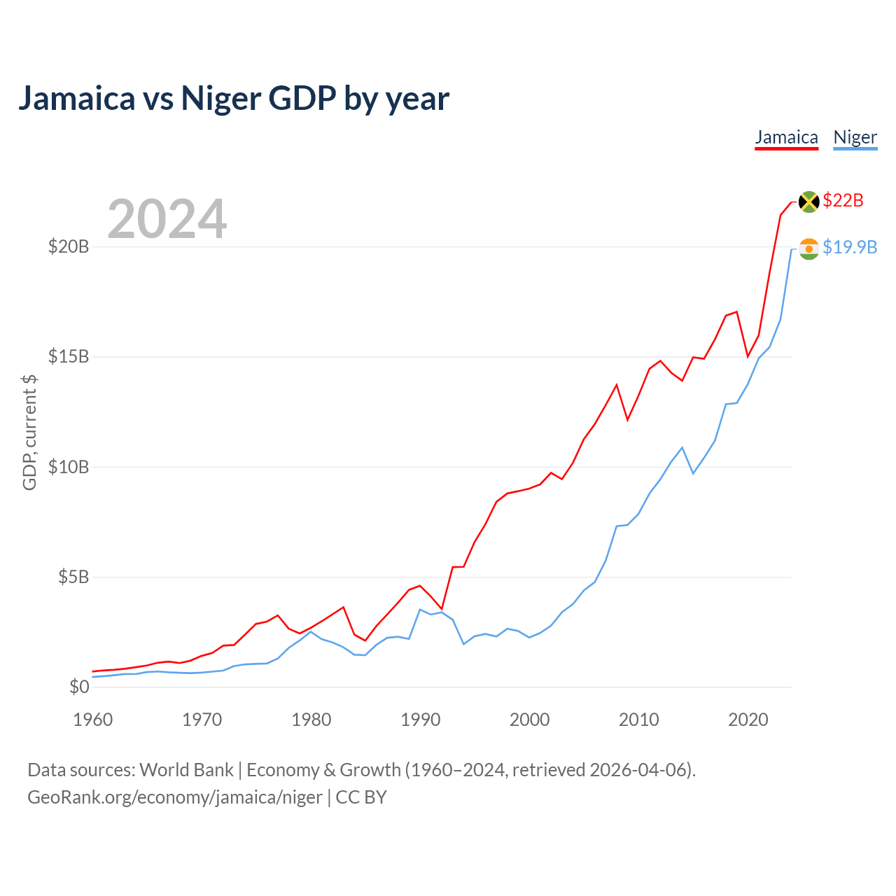 Jamaica has a GDP of $22B compared to $19.9B for Niger, ranking 124/197 and 130/197 by economy size, respectively.