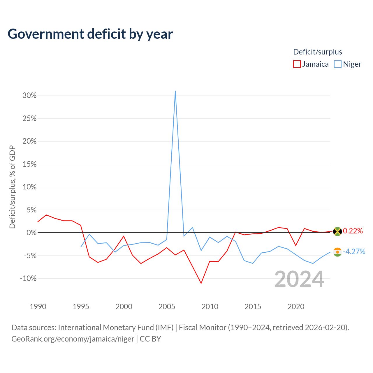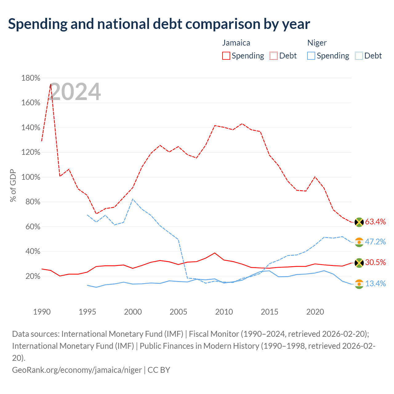Jamaica has $14B in government debt (63.4% of GDP), compared to $9.39B (47.2% of GDP) in Niger.