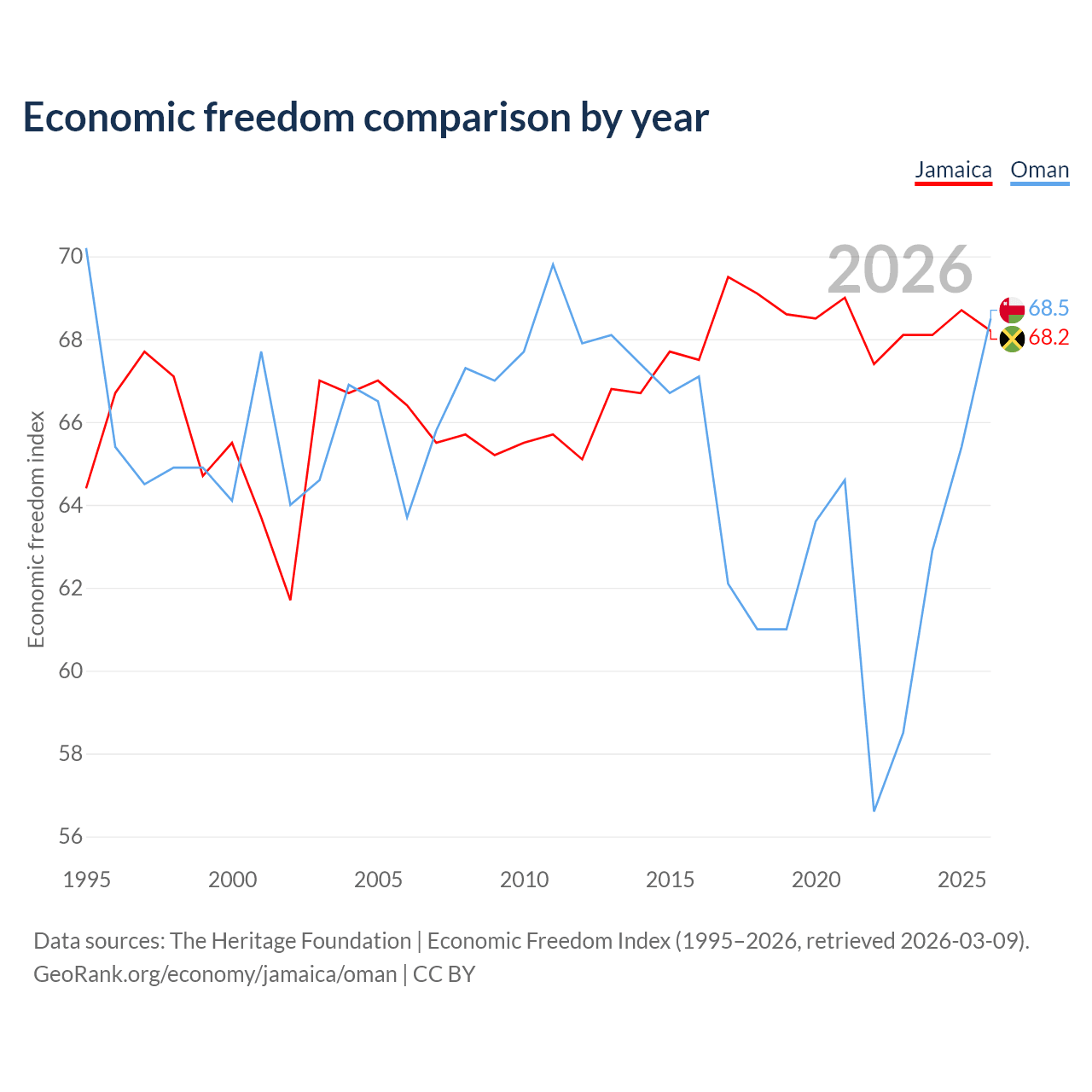The Economic Freedom Index for Jamaica is 68.2, ranking 48/197, compared to 68.5 for Oman, ranking 45/197. The chart above displays a comparison of annual changes in economic freedom indexes.