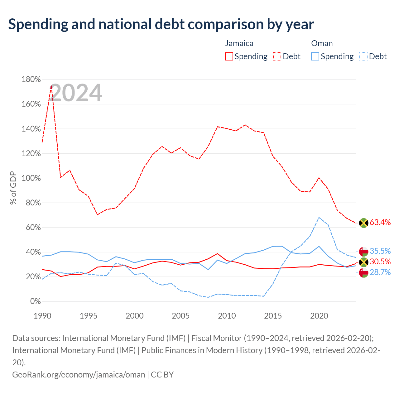 Jamaica has $14B in government debt (63.4% of GDP), compared to $38B (35.5% of GDP) in Oman.