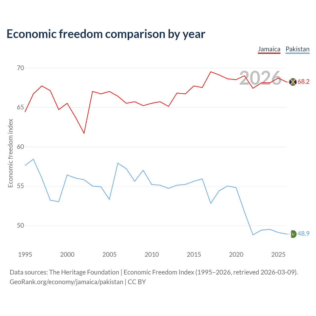 The Economic Freedom Index for Jamaica is 68.2, ranking 48/197, compared to 48.9 for Pakistan, ranking 168/197. The chart above displays a comparison of annual changes in economic freedom indexes.