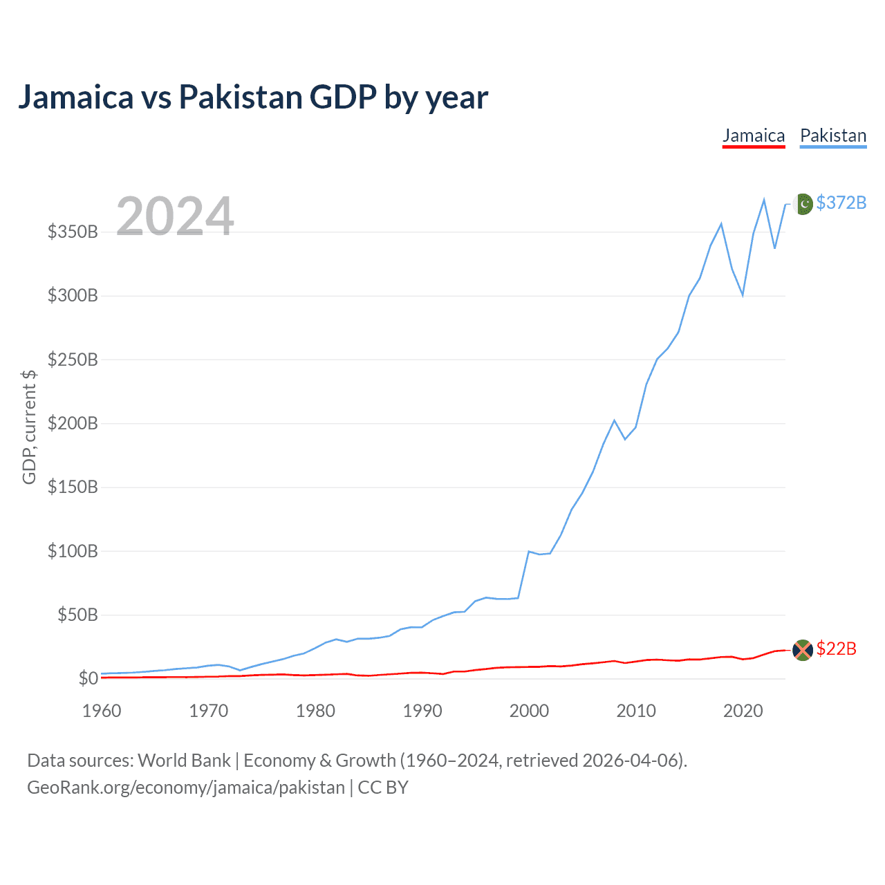 Jamaica has a GDP of $22B compared to $372B for Pakistan, ranking 124/197 and 43/197 by economy size, respectively.