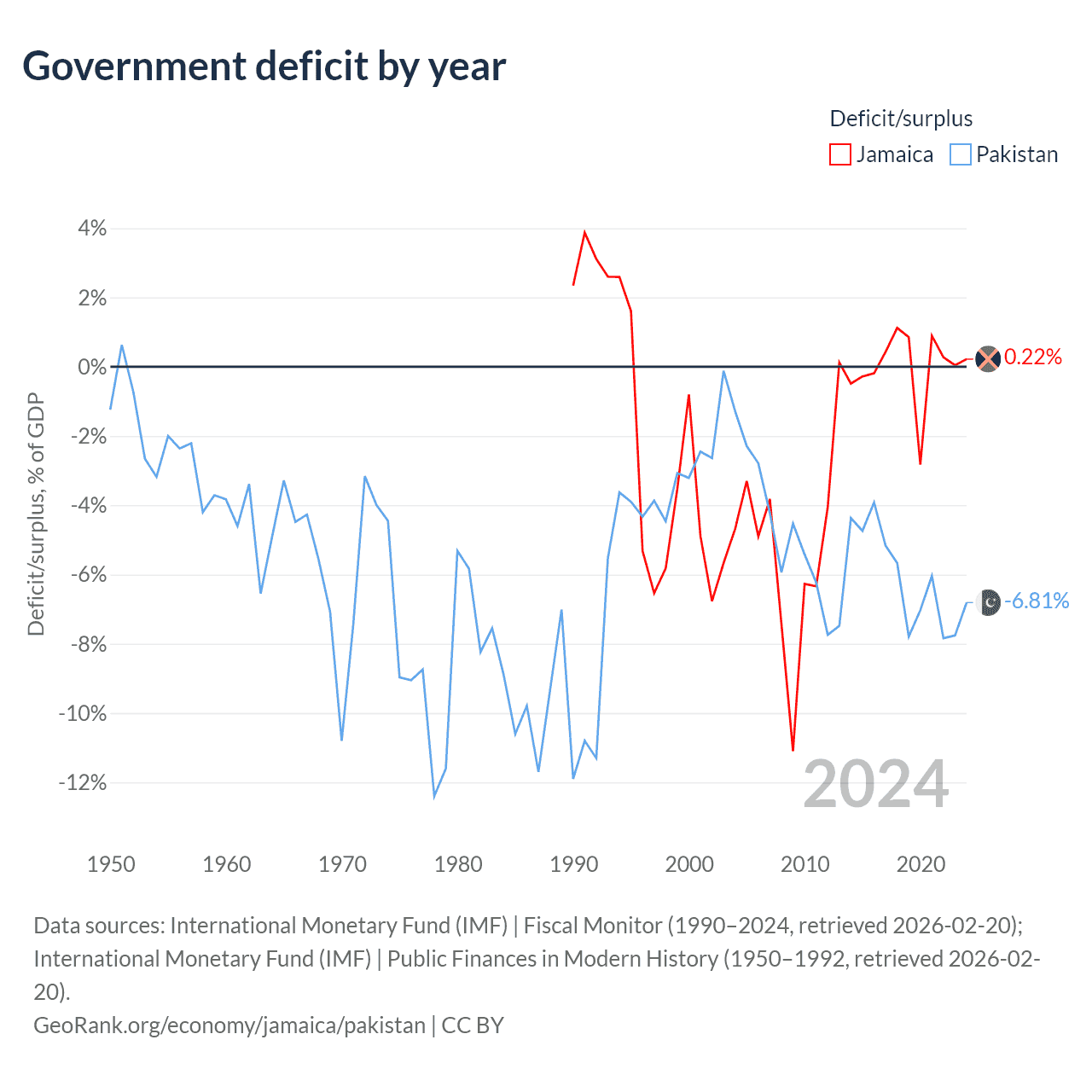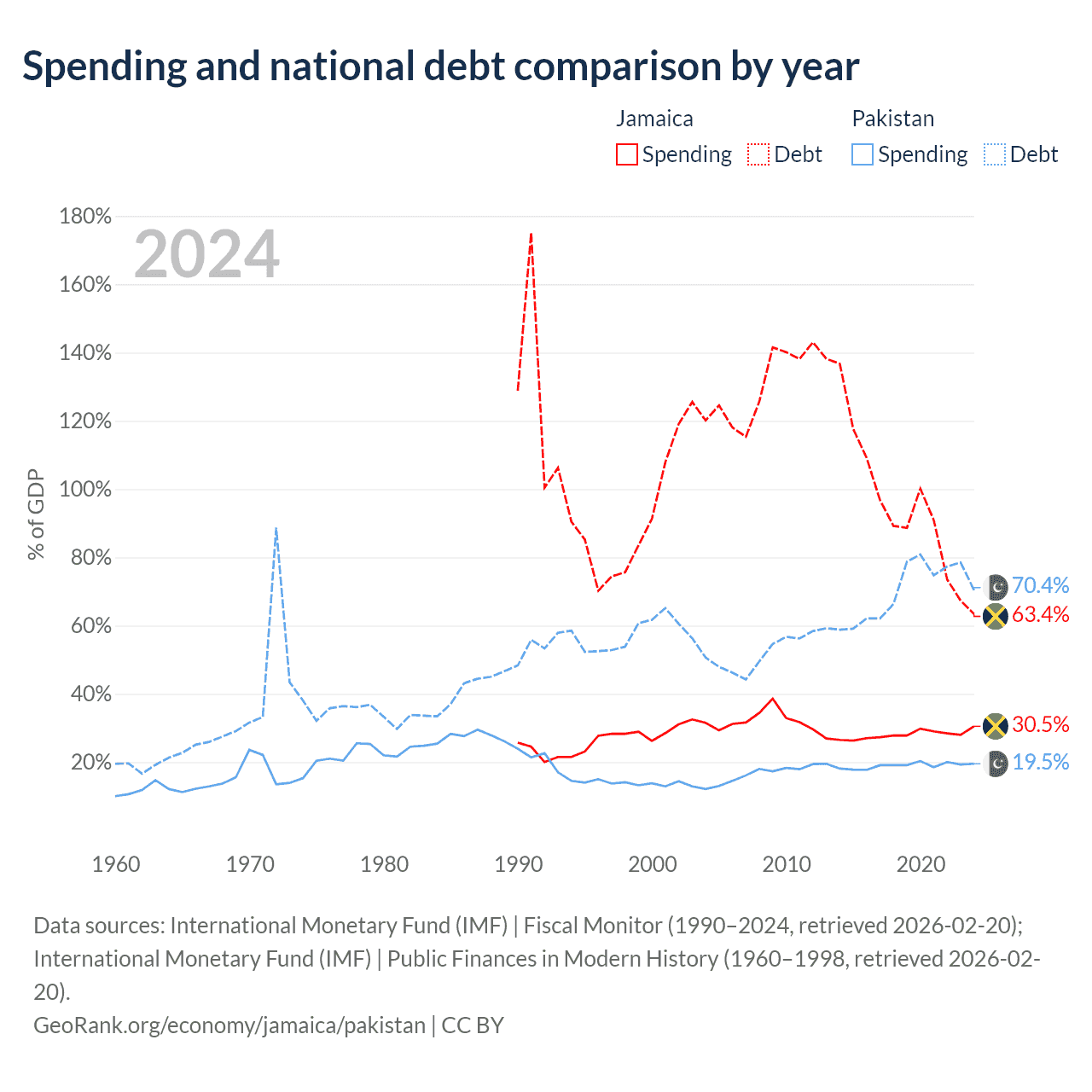 Jamaica has $14B in government debt (63.4% of GDP), compared to $262B (70.4% of GDP) in Pakistan.
