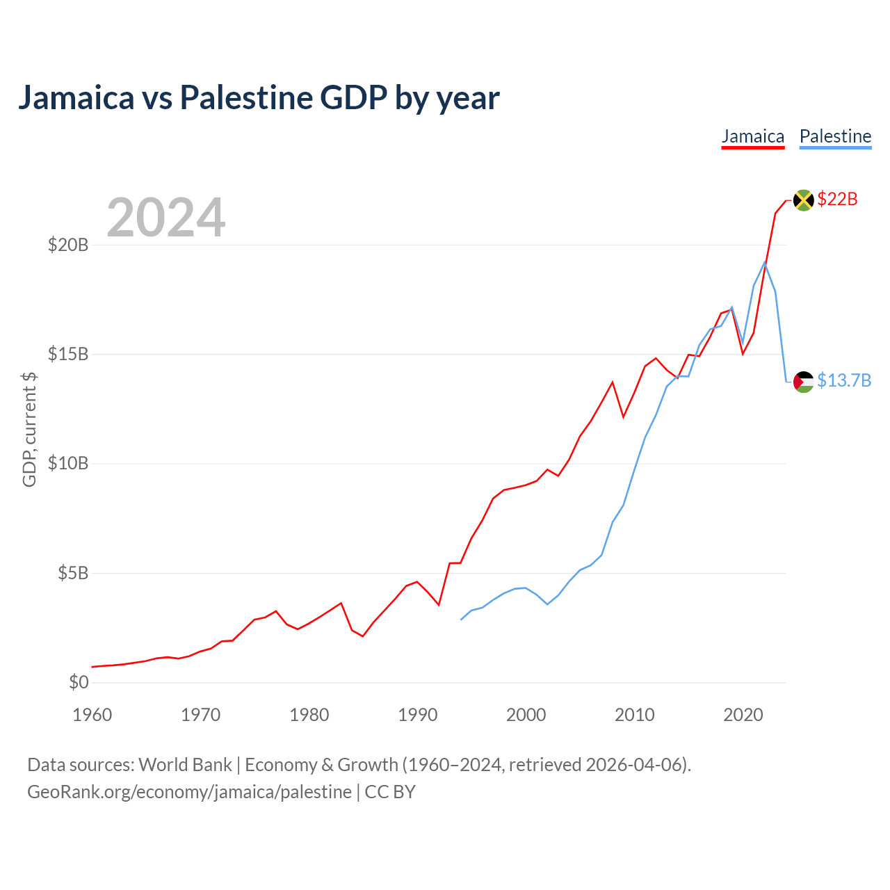 Jamaica vs Palestine GDP by year