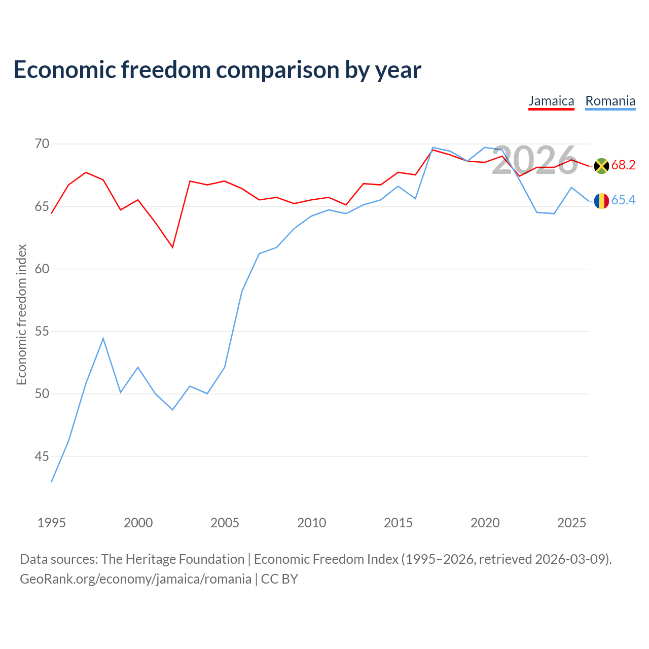The Economic Freedom Index for Jamaica is 68.2, ranking 48/197, compared to 65.4 for Romania, ranking 64/197. The chart above displays a comparison of annual changes in economic freedom indexes.