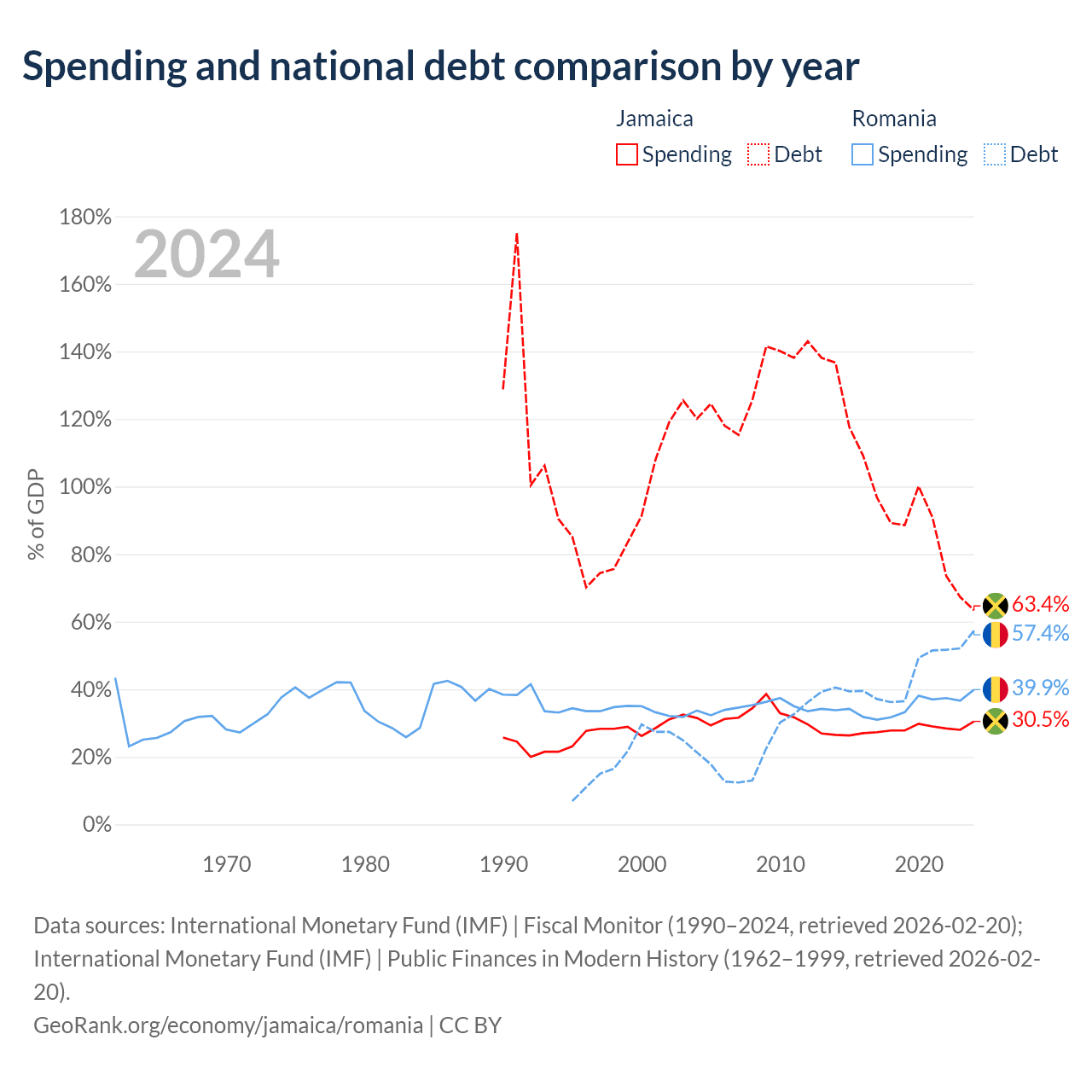 Jamaica has $14B in government debt (63.4% of GDP), compared to $220B (57.4% of GDP) in Romania.