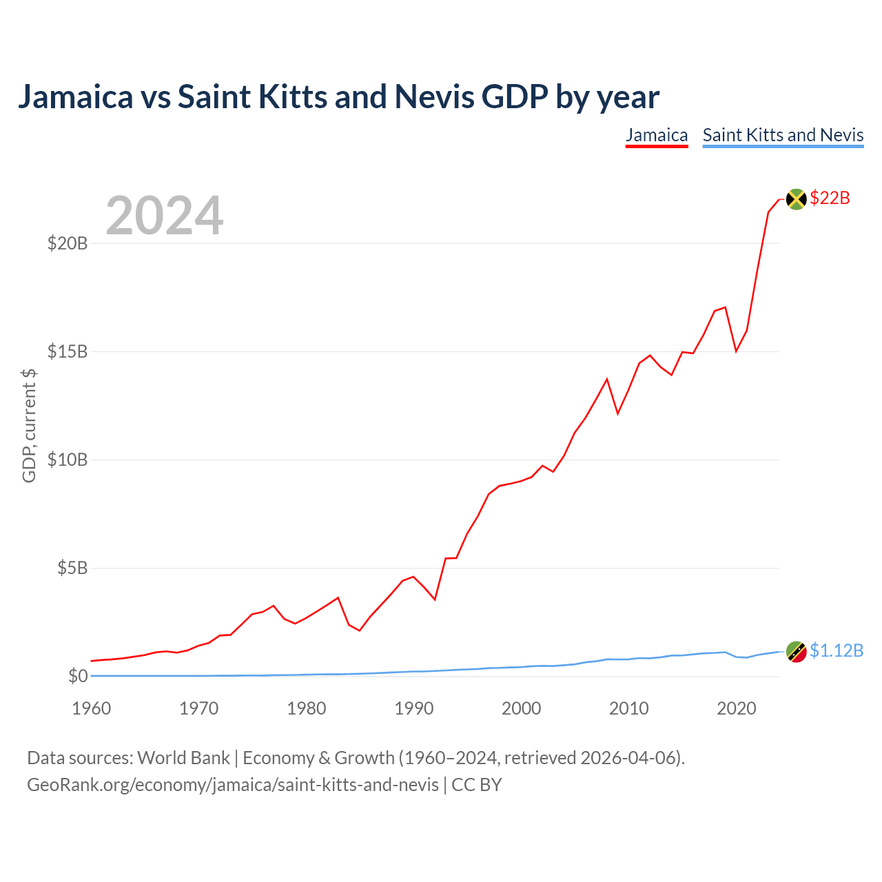 Jamaica has a GDP of $22B compared to $1.12B for Saint Kitts and Nevis, ranking 124/197 and 187/197 by economy size, respectively.