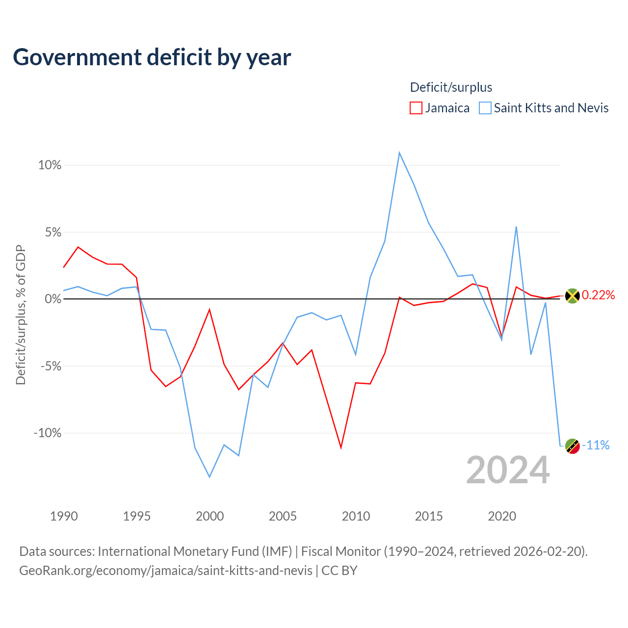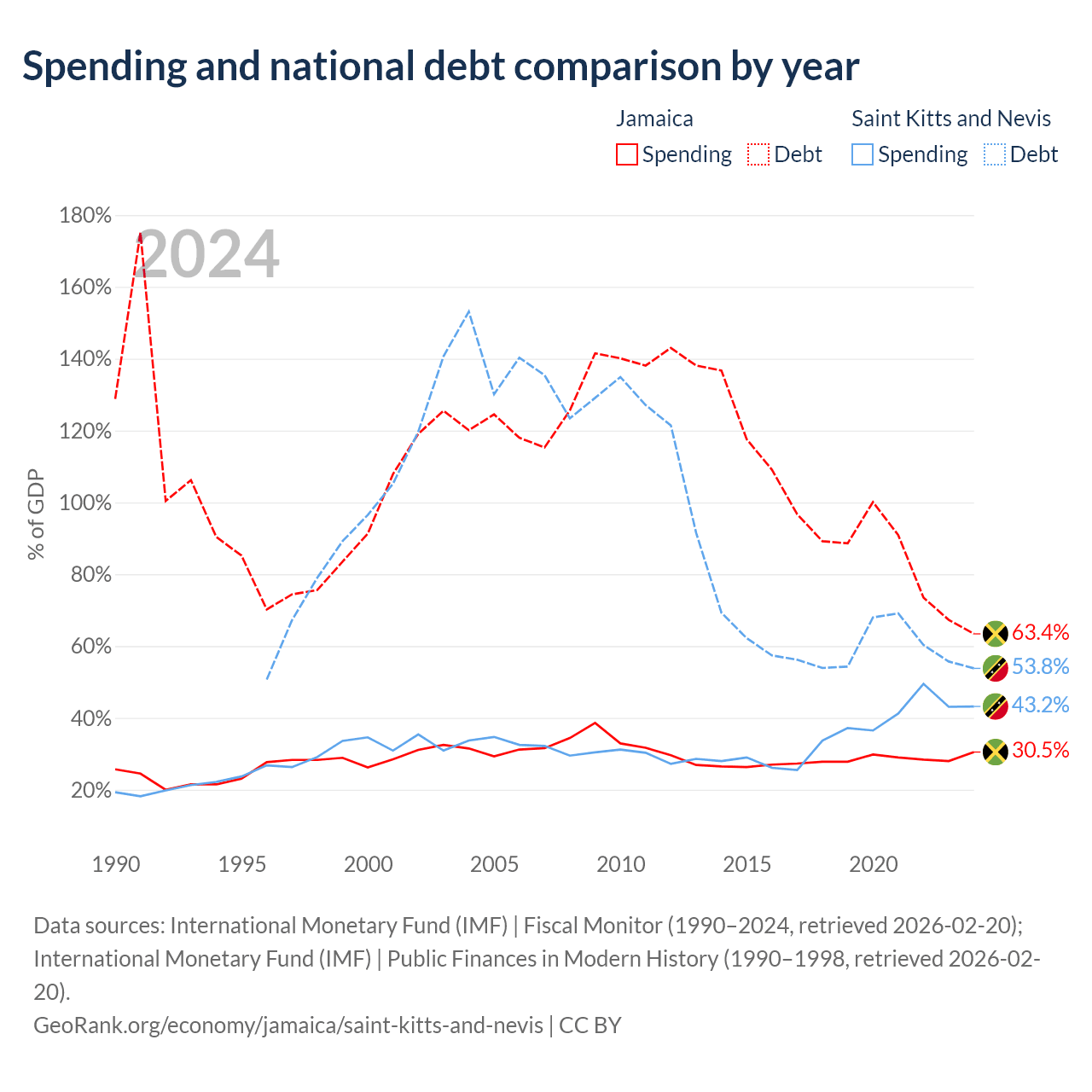 Jamaica has $14B in government debt (63.4% of GDP), compared to $604M (53.8% of GDP) in Saint Kitts and Nevis.