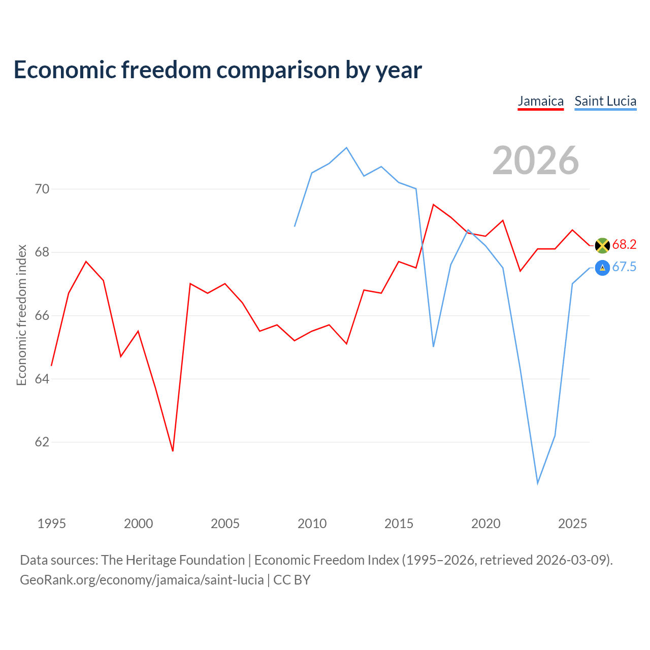 The Economic Freedom Index for Jamaica is 68.2, ranking 48/197, compared to 67.5 for Saint Lucia, ranking 57/197. The chart above displays a comparison of annual changes in economic freedom indexes.